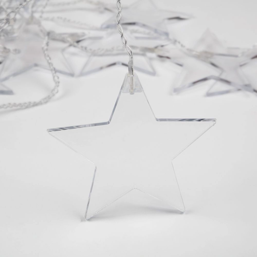 Светодиодная гирлянда Звезды - оригинальное интерьерное украшение с минималистичным дизайном. На прозрачном проводе длиной три метра расположены десять пластиковых фигурных насадок с диодами теплого свечения.