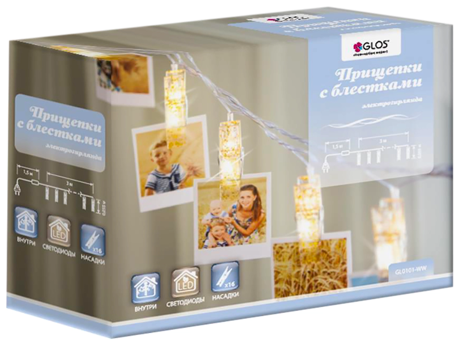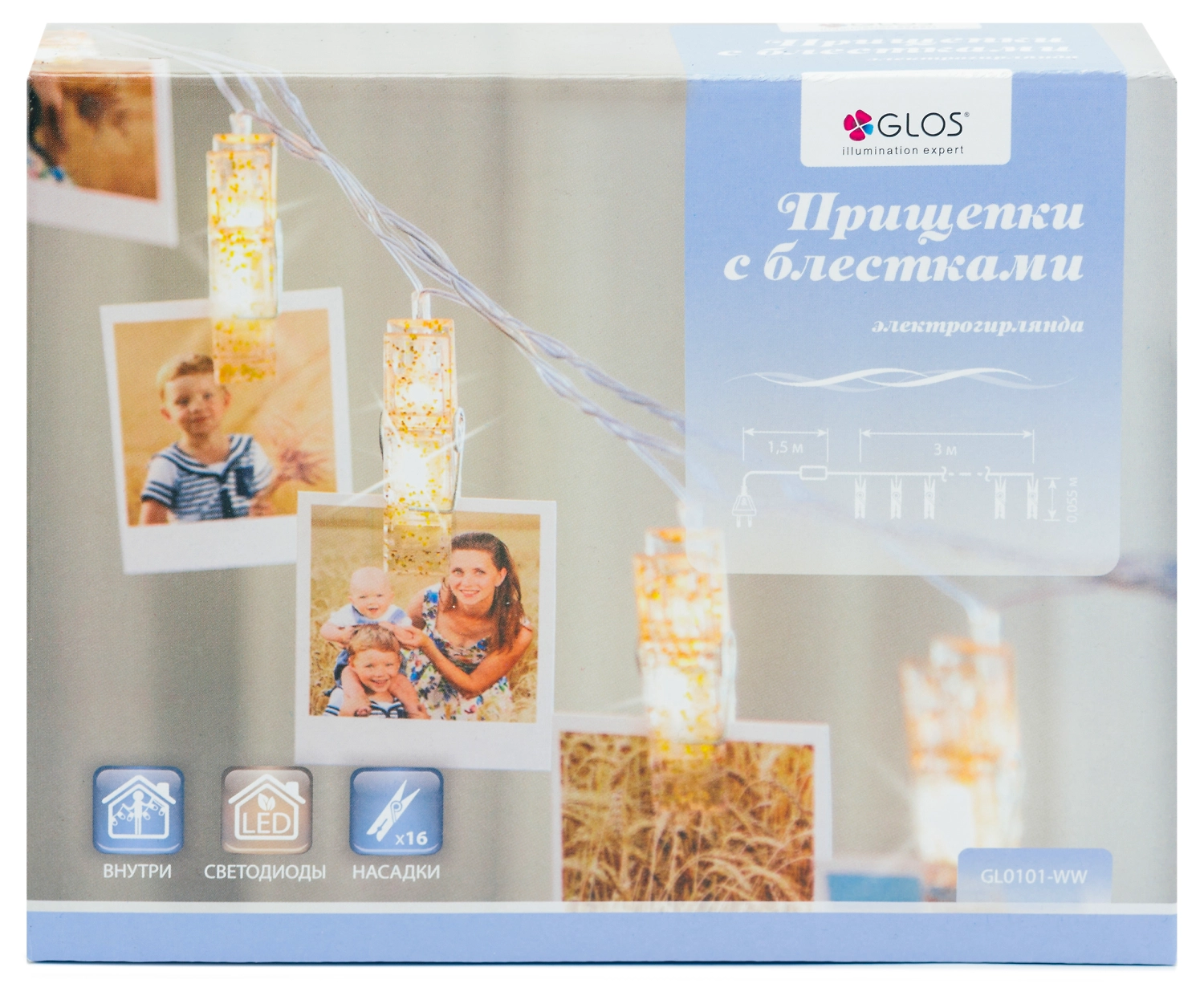 Гирлянда внутренняя Прищепки с блестками 16 LED теплый белый 3 м
