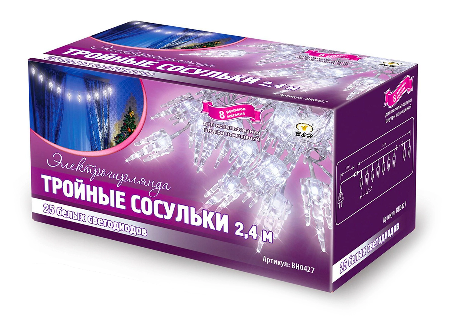Гирлянда внутренняя с насадками B&H Тройные сосульки 25 LED холодный белый 2,4 м