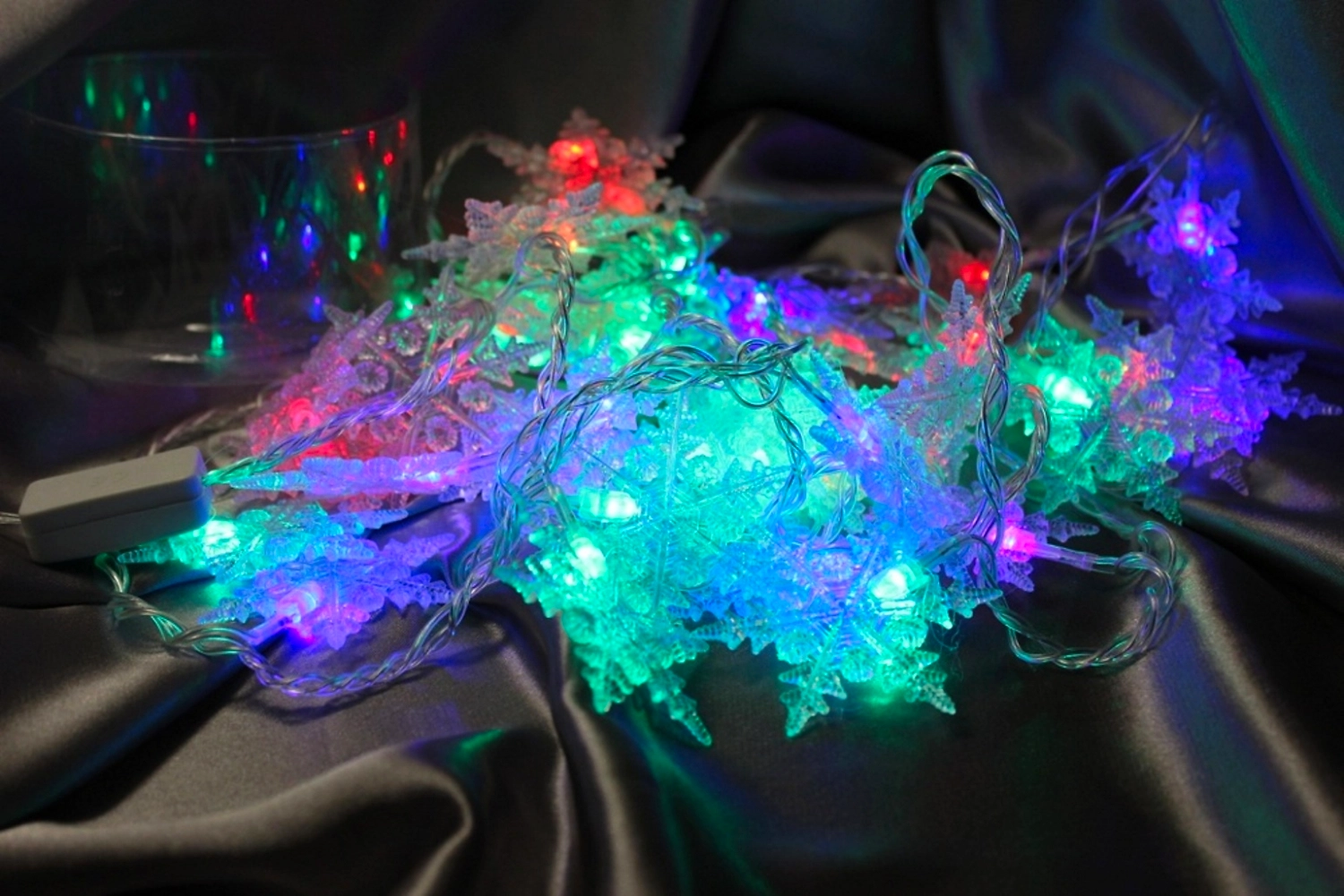 Внутренняя гирлянда Снежинки состоит из 30 разноцветных лампочек, расположенных на расстоянии 10 см друг от друга.