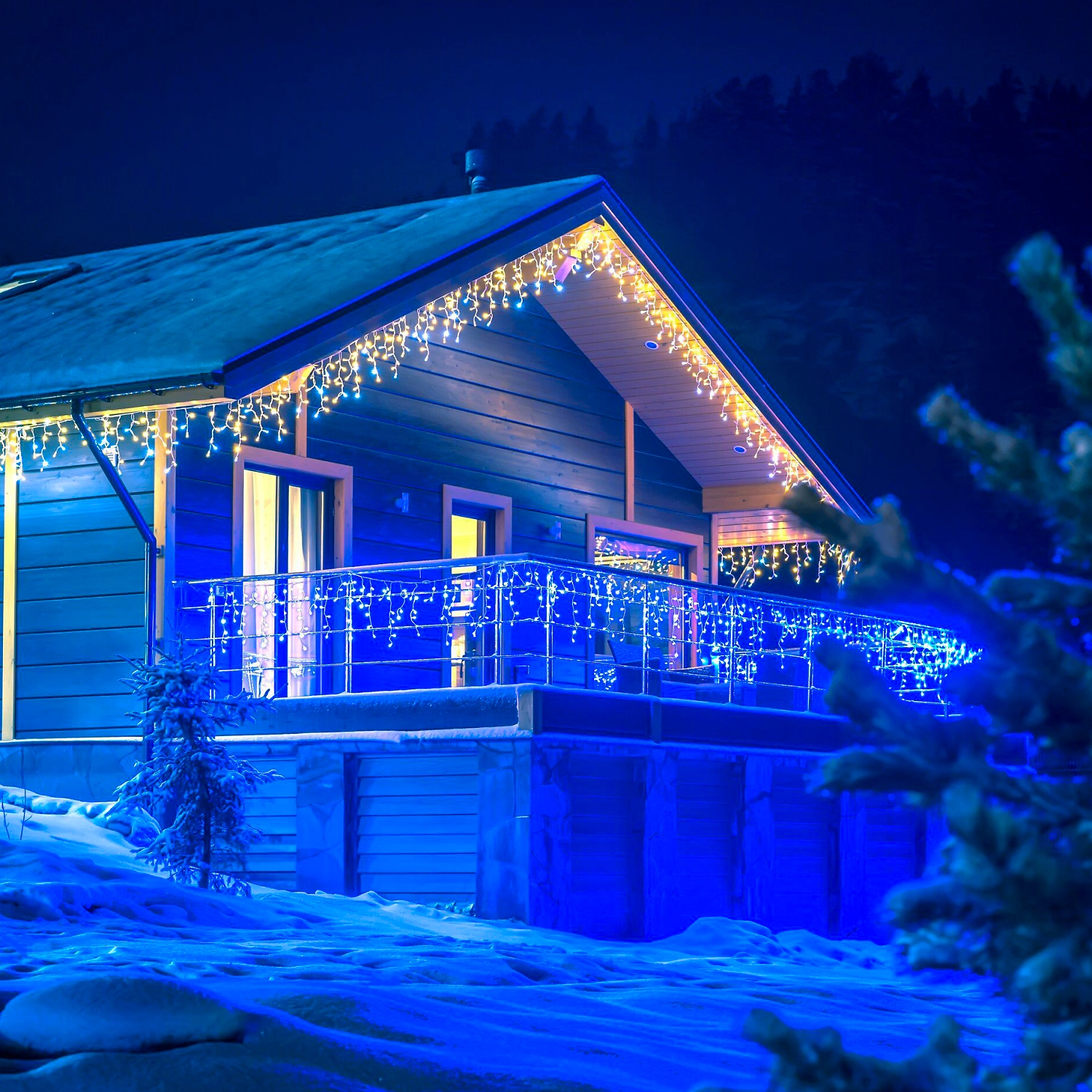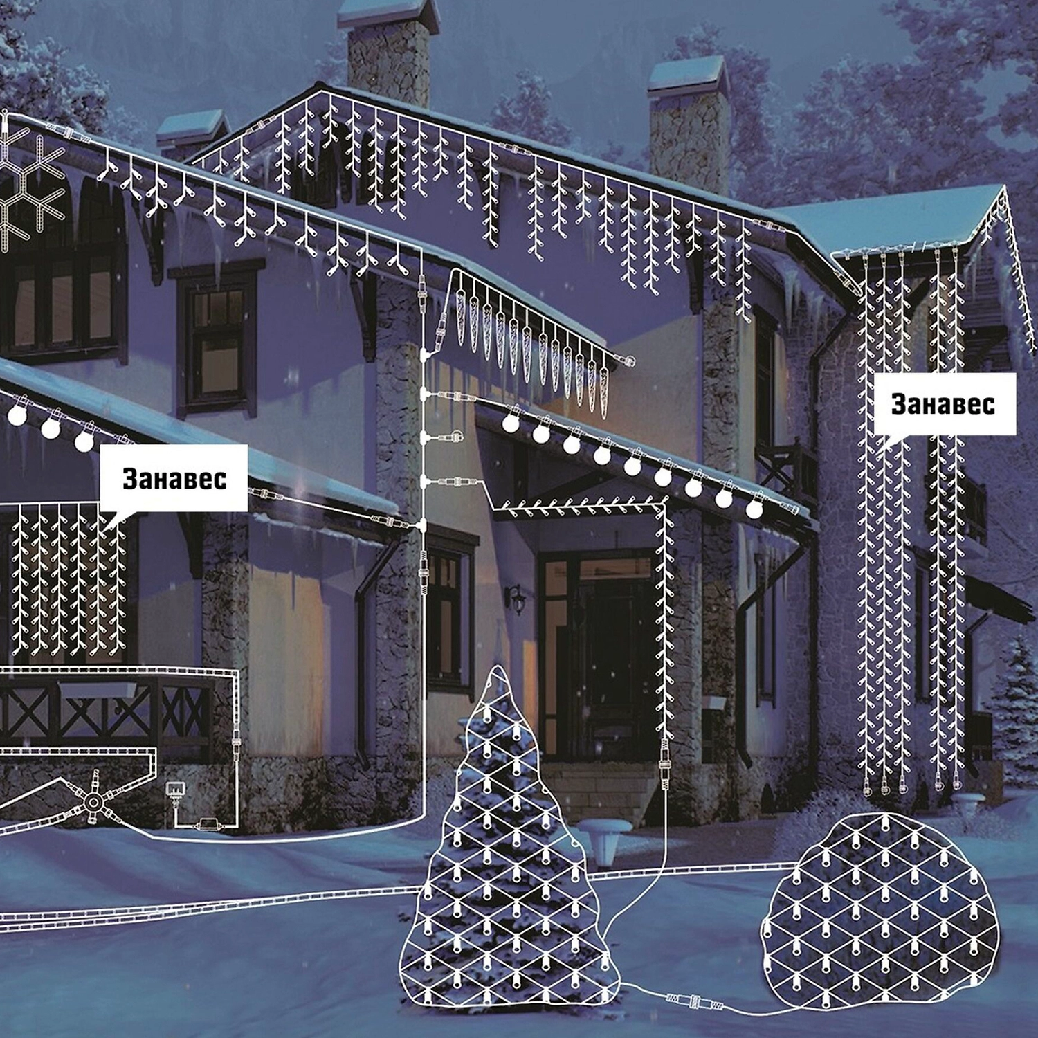 Уличная гирлянда представляет собой эффектно свисающий занавес, стоящий из 6 нитей. 78 постоянно горящих светодиодов разбавлены 24 мигающими лампочками для создания эффекта искрящихся кристаллов.