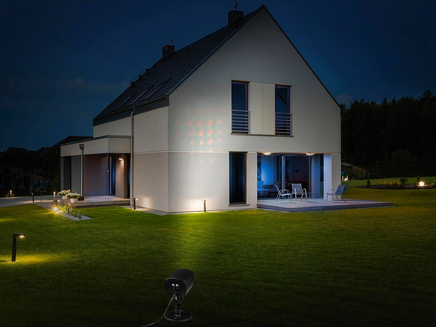 Уличный проектор предназначен для праздничной иллюминации. С его помощью можно подсвечивать деревья, украшать стены домов, коттеджей, отелей, ресторанов и других зданий.