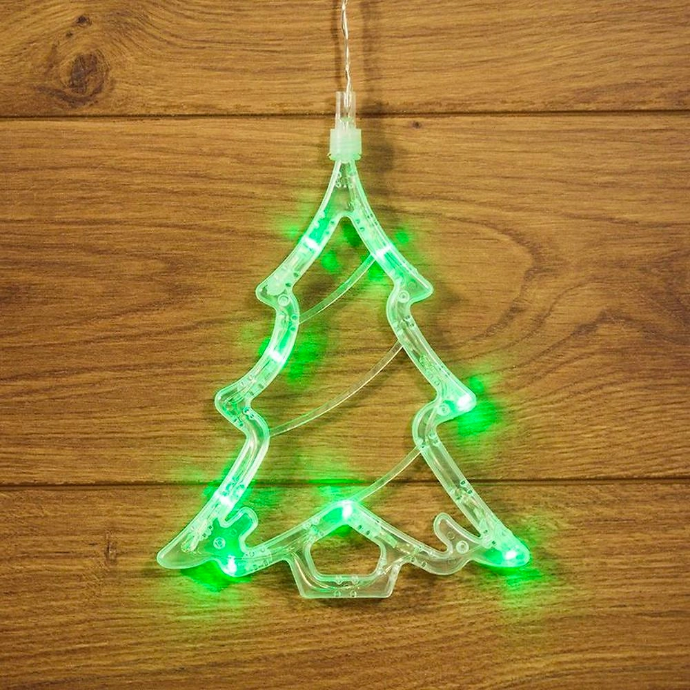 Фигура светодиодная выполнена из пластикового короба в форме "Елочки" внутри которого равномерно расположены 8 светодиодов зеленого цвета свечения. Фигура крепится на ровную гладкую поверхность на присоску, которая расположена на батарейном блоке на расстоянии 20 см от фигуры на подвесе. Питание осуществляется при помощи 3 батареек типа AAA.