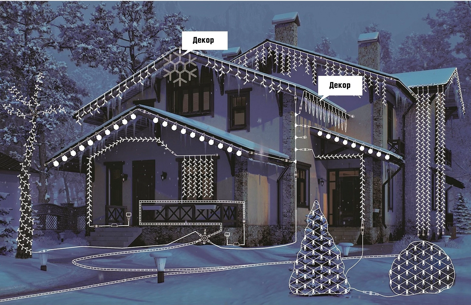 Гирлянда снежинка светодиодная благодаря большому диаметру заметна издалека. Она красиво увенчает конек крыши или станет ярким акцентом на входной двери. Гирлянда также может использоваться внутри помещений и подвешиваться на стену, над камином или в оконном проеме.