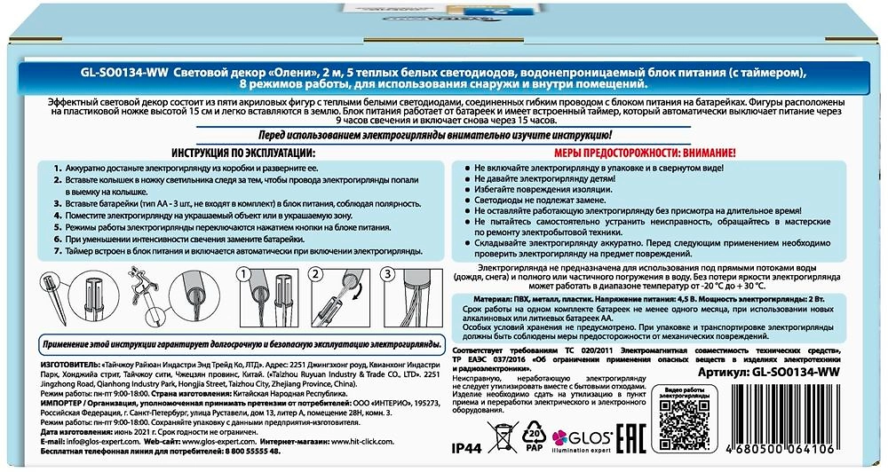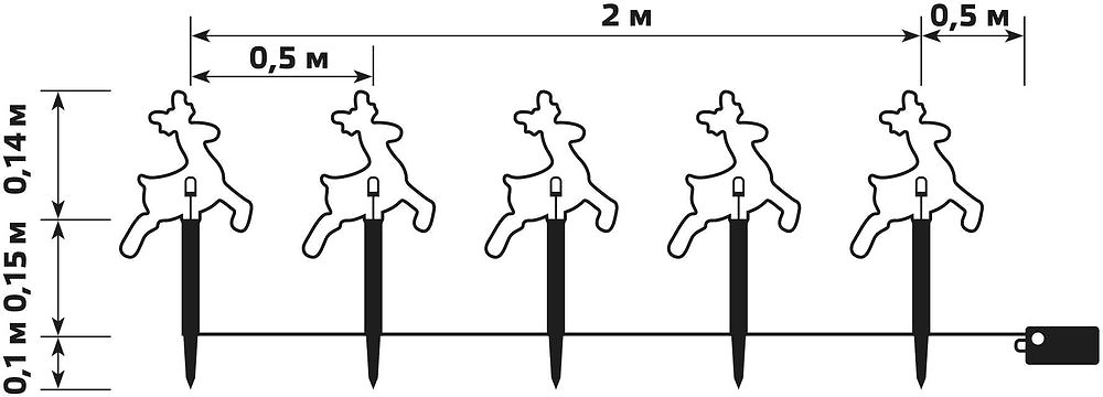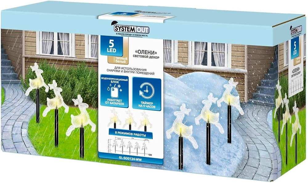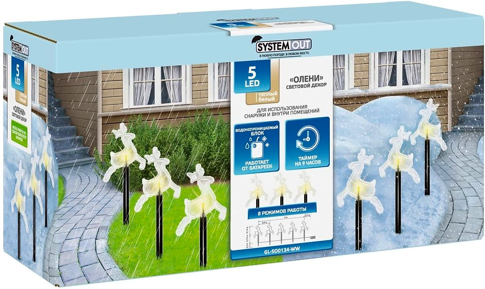 Световой декор Олени состоит из пяти фигур с теплыми белыми светодиодами. Гирлянда соединена гибким проводом длиной два метра. Каждая фигура закреплена на пластиковой ножке высотой 15 см, которая легко вставляется в землю. Водонепроницаемый блок питания работает от трех пальчиковых батареек, имеет встроенный таймер, который автоматически отключает гирлянду через 9 часов свечения и включает вновь через 15 часов.