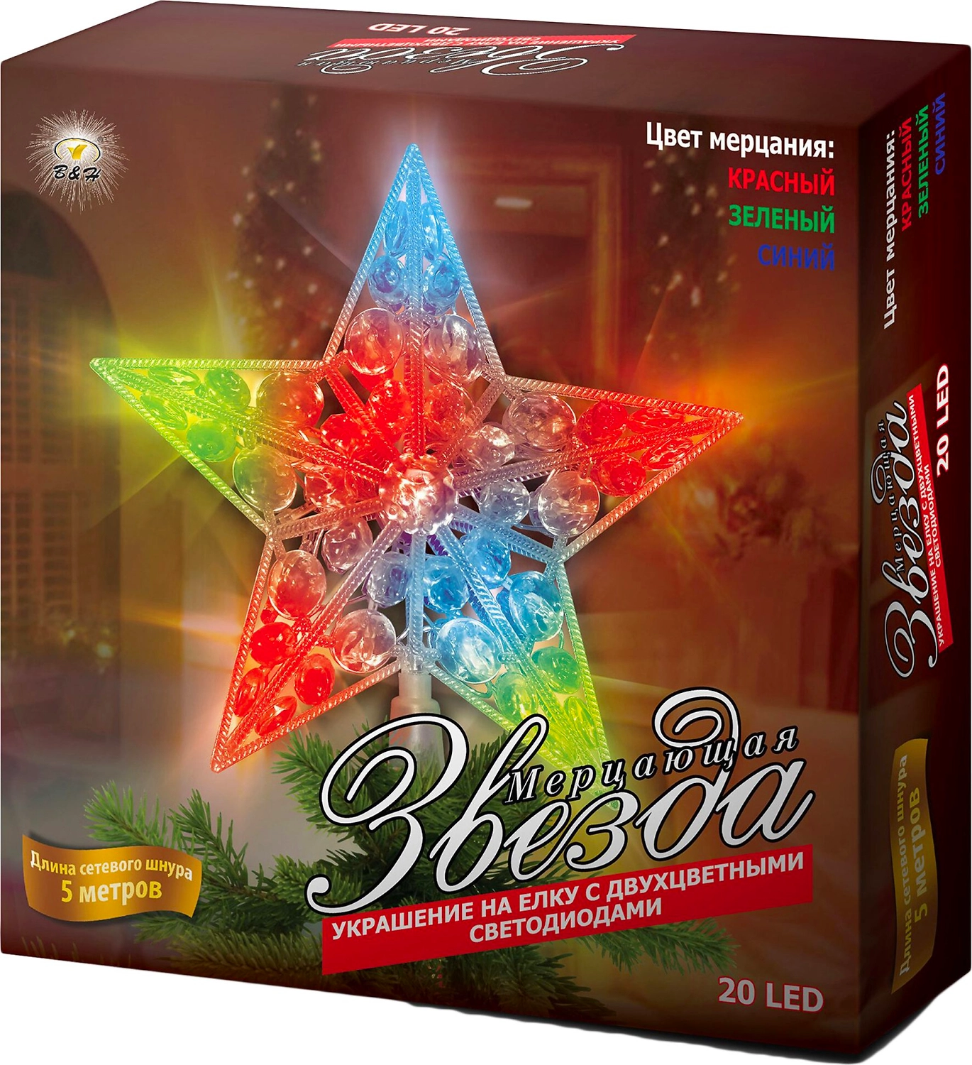 \- Длинный неброский провод. Верхушка на елку Звезда снабжена пятиметровым сетевым шнуром, что позволяет устанавливать ее даже на высокие живые и искусственные деревья. Кабель зеленого цвета незаметен среди ветвей.