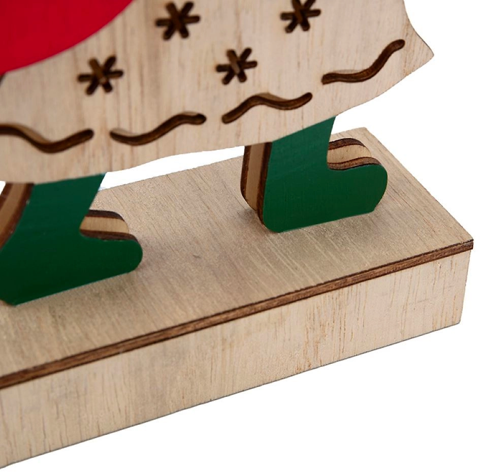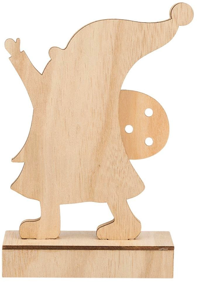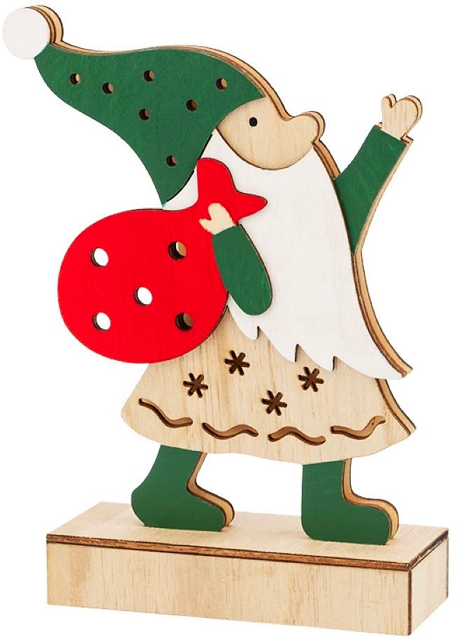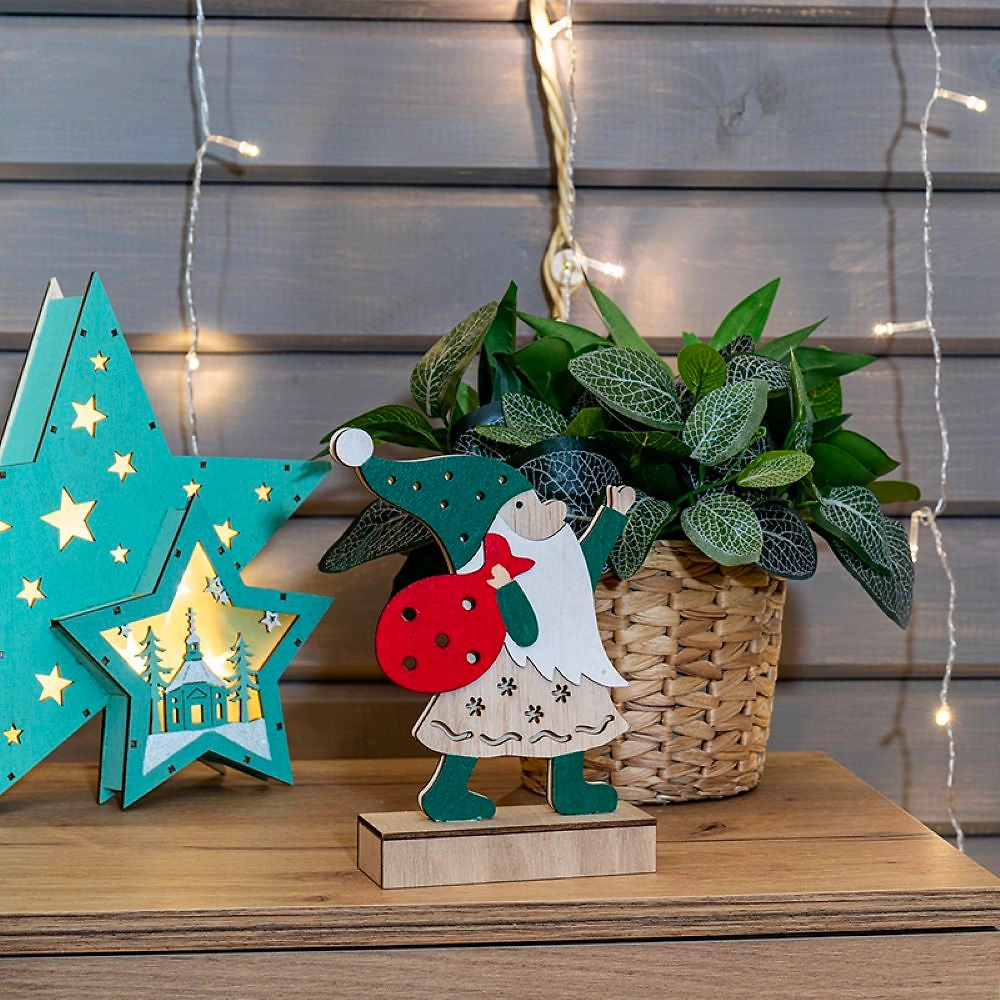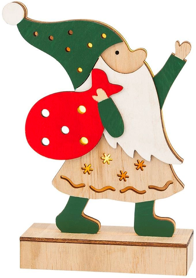 Деревянная фигурка с подсветкой «Дед Мороз» высотой 18 см работает от двух батареек типа ААА, поэтому ее можно разместить в любом уголке вашего дома, не уделяя внимание поиску розеток.