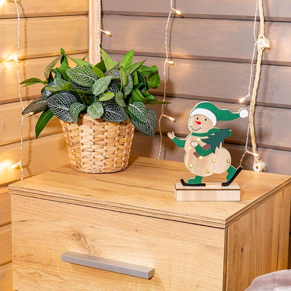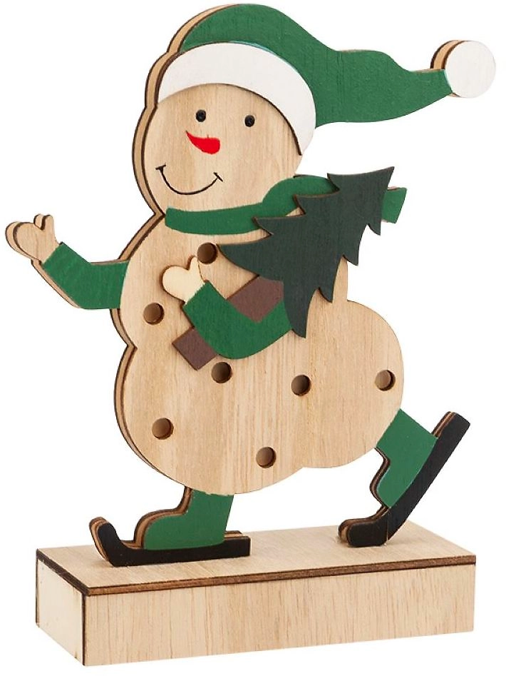 Деревянная фигурка с подсветкой «Снеговик» высотой 18 см выполнена в виде забавного персонажа — одного из главных символов Нового года. Улыбающийся снеговик, застывший в дружелюбном жесте, держит в руках елку. Композиция вызывает ассоциацию с доброй волшебной сказкой и создает радостное настроение окружающим. В качестве элементов питания используются 2 батарейки типа ААА. 5 экономичных диодов излучают теплый белый свет и мягко обрамляют яркую композицию. Изделие произведено из экологичных материалов, не вызывающих аллергию.