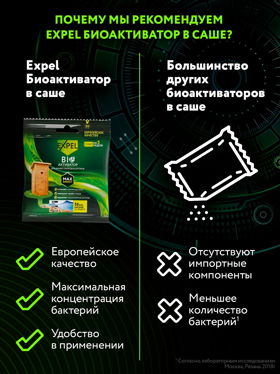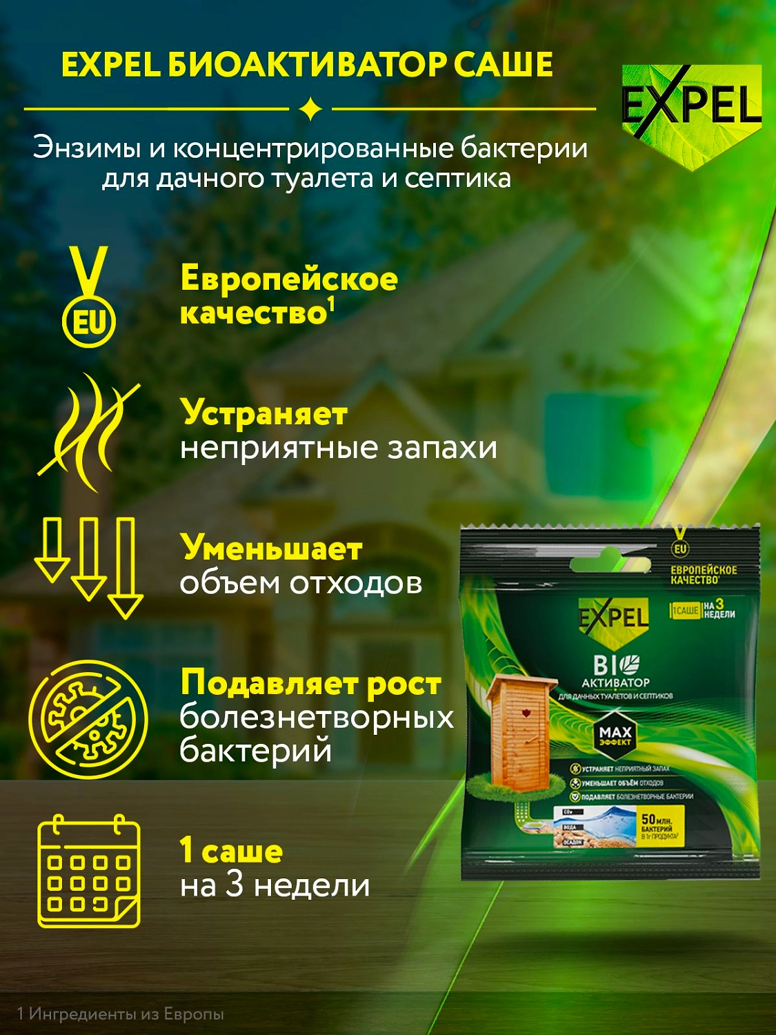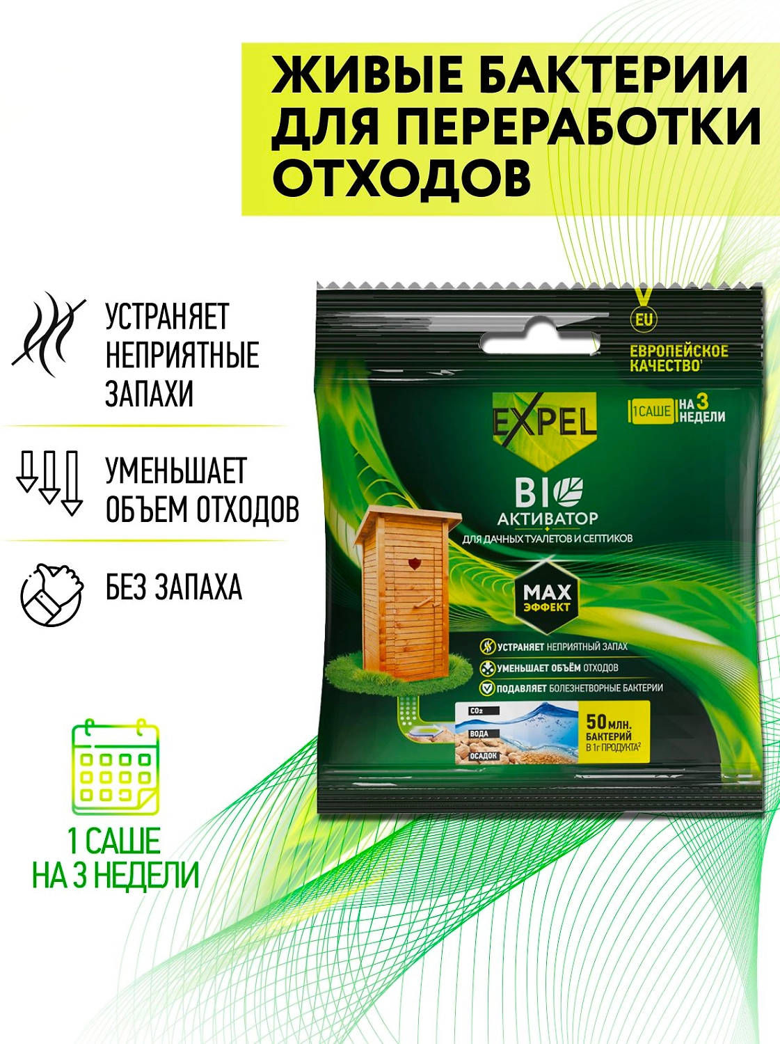 Принцип работы: биоактиватор содержит концентрированные культуры бактерий, которые разлагают фекальные массы на воду, углекислый газ и соли. Благодаря наличию в составе энзимов, средство начинает работать сразу после внесения.