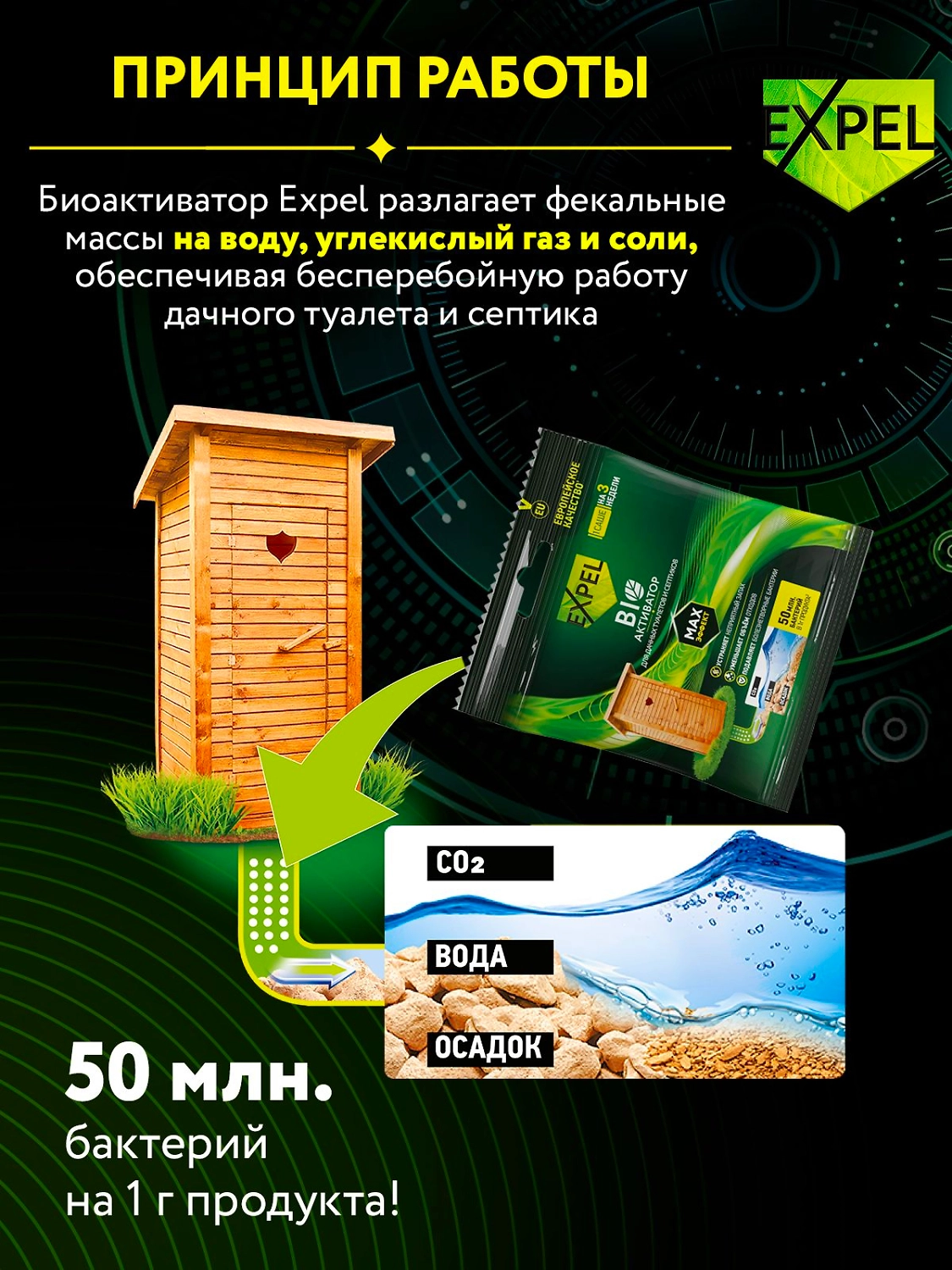 Принцип работы: биоактиватор содержит концентрированные культуры бактерий, которые разлагают фекальные массы на воду, углекислый газ и соли.