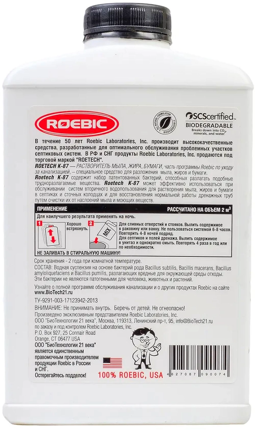 K-87 содержит специальные бактерии, уничтожающие мыльные скопления в трубах. Расщепитель мыла Roetech K-87 - это смесь специальных запатентованных бактерий, которые размножаются в среде с высоким содержанием мыла и очищающих средств. Эти бактерии обладают генетическими способностями разрушать мыло и чистящие средства, нейтрализуя их вредных эффект для прочих микроорганизмов, при этом сами не оказывают никакого негативного влияния. Куда бы ни уходила Ваша мыльная вода - в септик, выгребную яму или систему утилизации - Вы всегда должны использовать этот продукт, минимум - два раза в год (или чаще - по необходимости). К-87 легок в использовании: нужно равномерно (по 75-150 мл) залить его в септик: через унитаз, трап в душе, в сливы в ванне и на кухне. Для ухода за нормально функционирующим септиком используйте 500 мл "Roetech-87" на резервуар емкостью 2000 литров. (Для проблемного септика - двойную дозу). Этот продукт содержит смесь полезных бактерий, которые живут в септическом окружении (где мало кислорода и много нитратов). В результате их метаболизма ускоряется разложение мыльных растворов, что дает возможность для нормальной работы биопрепаратов, применяемых для разложения фекалий. в результате септик сохраняется в рабочем состоянии. Бактериальный компонент 100% Roebic, USA Растворитель мыла, жира, бумаги, часть программы Roebic по уходу за канализацией, специальное средство для разложения мыла, жиров, бумаги. Roetech K-87 может эффективно использоваться при обслуживании систем вторичного водопользования для растворения мыла, жиров и бумаги в септиках и сточных колодцах и для восстановления нормальной работы дренажных труб путем очистки их от наслоений мыла и моющих веществ. Водная суспензия на основе бактерий рода Bacillus subtilis, Bacillis macerans, Bacillus amyloliquefaciens и Bacillus pumilis, разлагающих вредные для окружающей среды отходы. Эти бактерии не являются патогенными для человека, животных и растений. Применение: 1. Хорошо встряхнуть флакон. 2. Для сливных отверстий и стояков: для одного применения разбавить 230 мл средства теплой (не горячей) водой объемом 350 мл и вылить в раковину или ванну. Не пользоваться системой 6-8 часов. Повторить 4-8 ночей подряд. Для септиков и полей дренажа: Вылить содержимое в унитаз и однократно смыть. Повторять 4 раза в год или по необходимости. Для лучшего результата применять на ночь. Не заливать в стиральную или посудомоечную машину! Флакон объемом 946 мл обслуживает резервуар 2 куб.м.