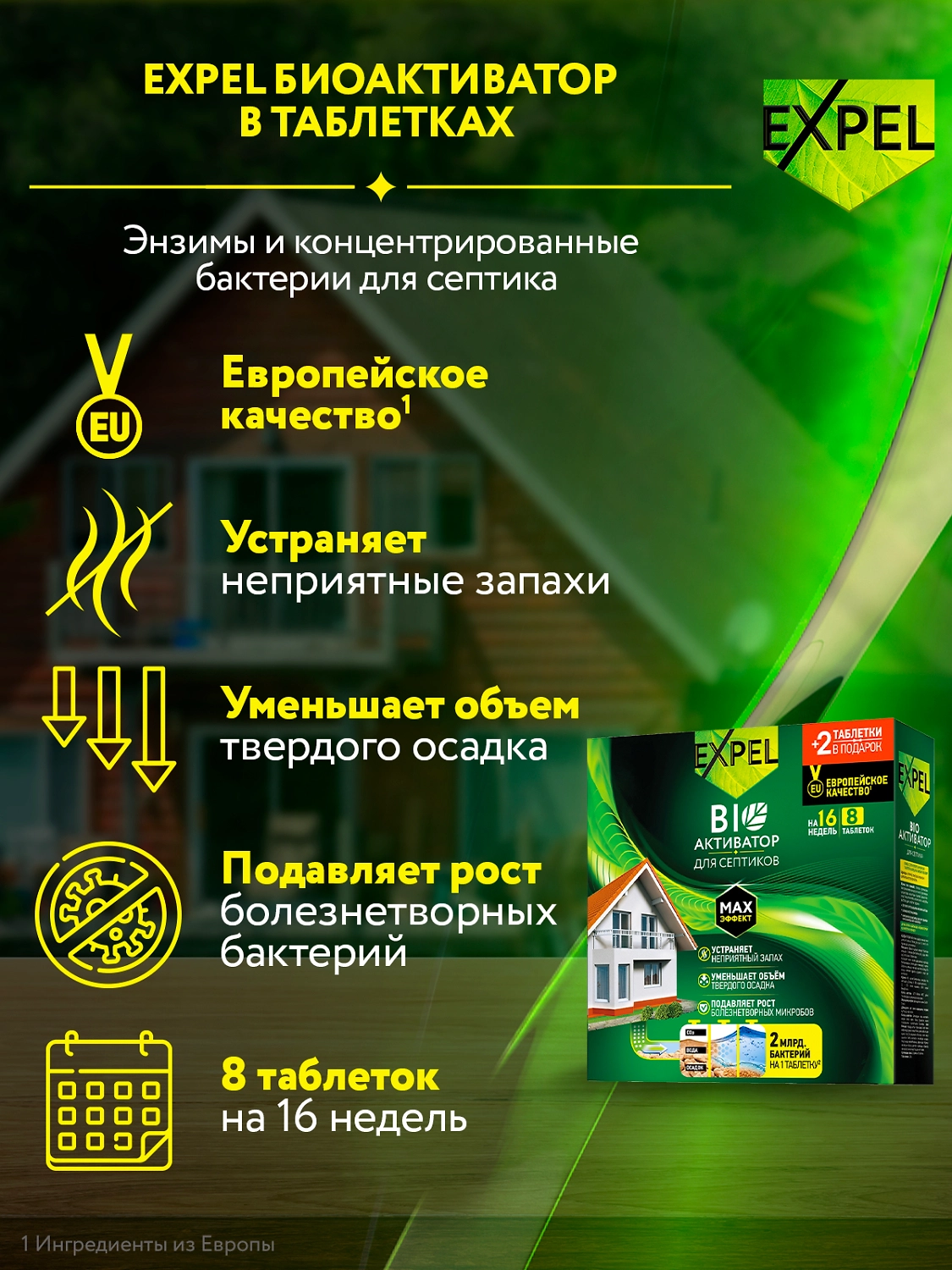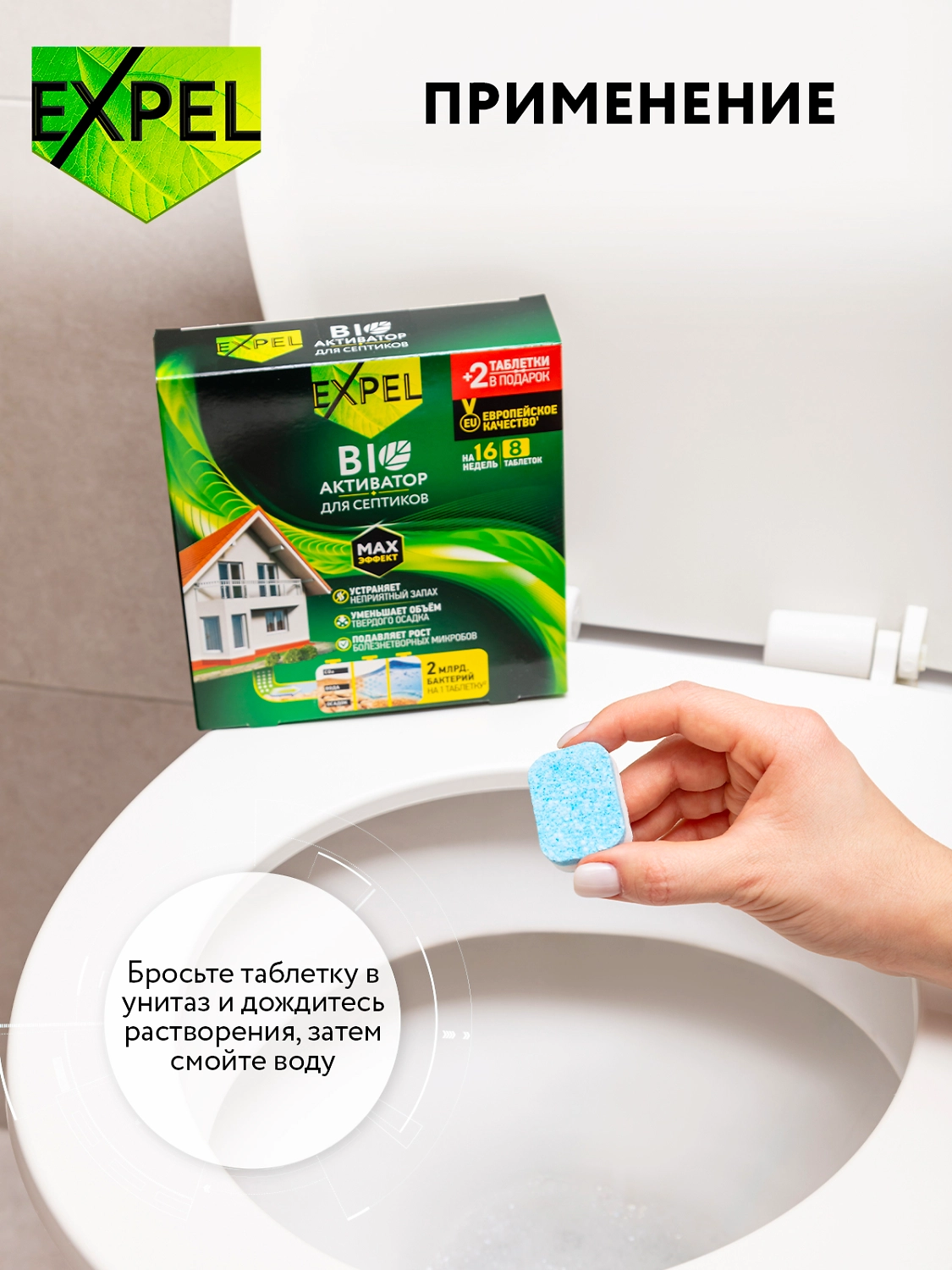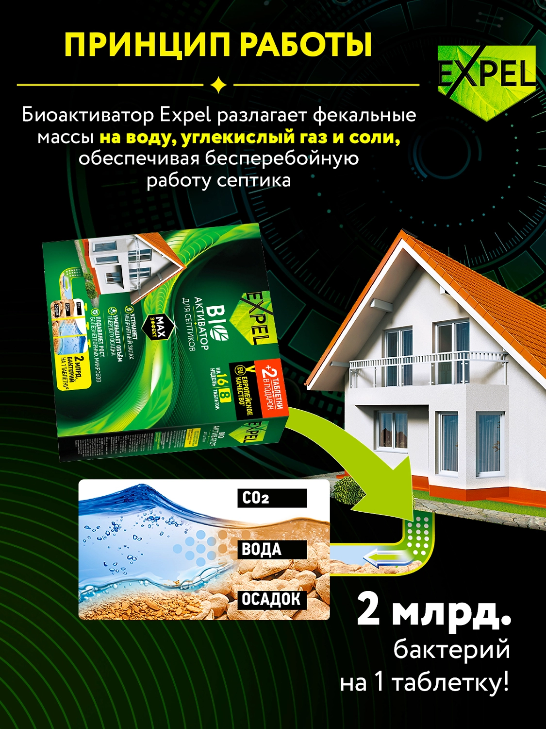 Экологически чистый продукт на базе микроорганизмов. Бактерии активизируются через один-два часа после попадания в воду и начинают разлагать отходы на воды, соли и углекислый газ.