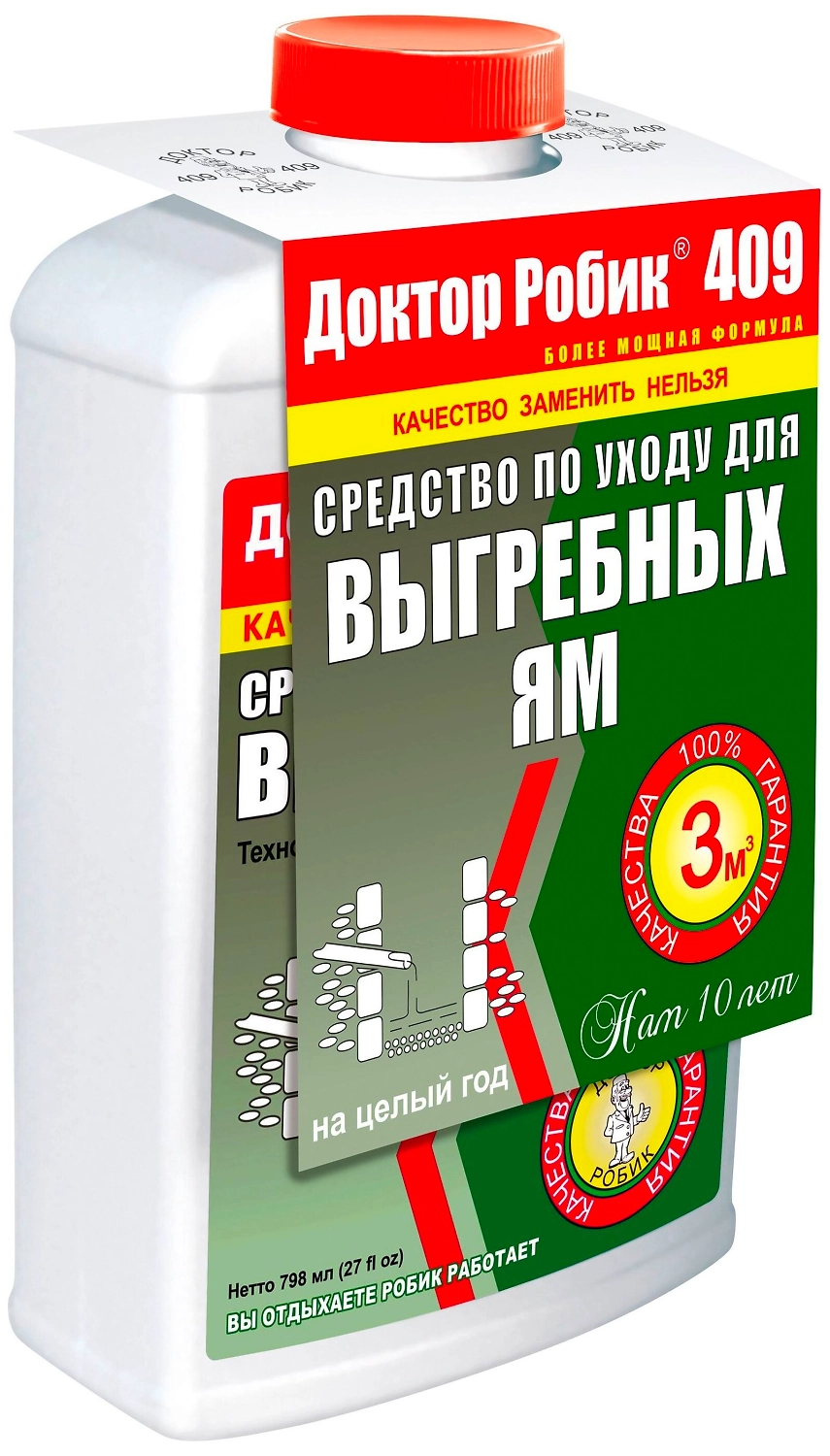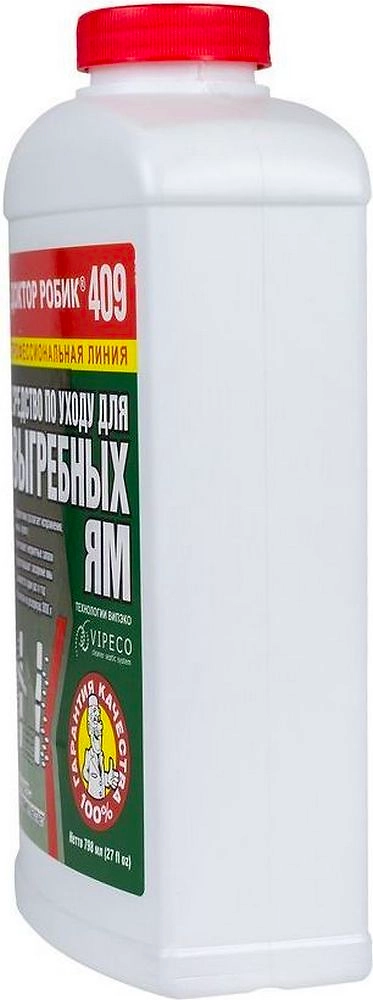 Средство по уходу за выгребными ямами 409 "Доктор Робик" в течение целого года нейтрализует неприятные запахи, расщепляет сложные органические соединения, в том числе бумагу, мочевину, белки и жиры,