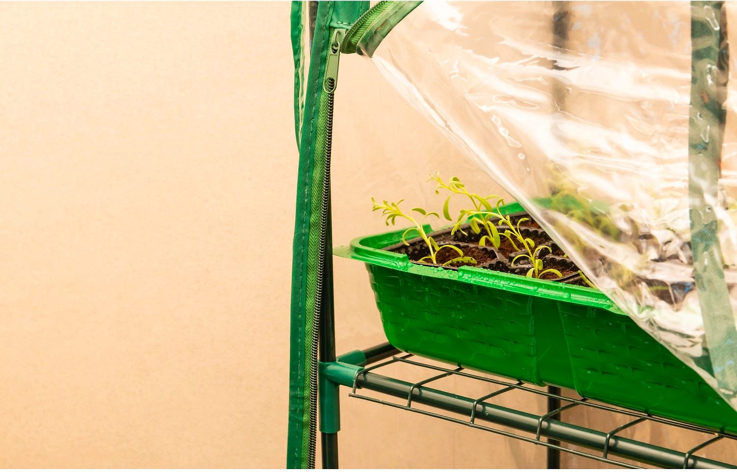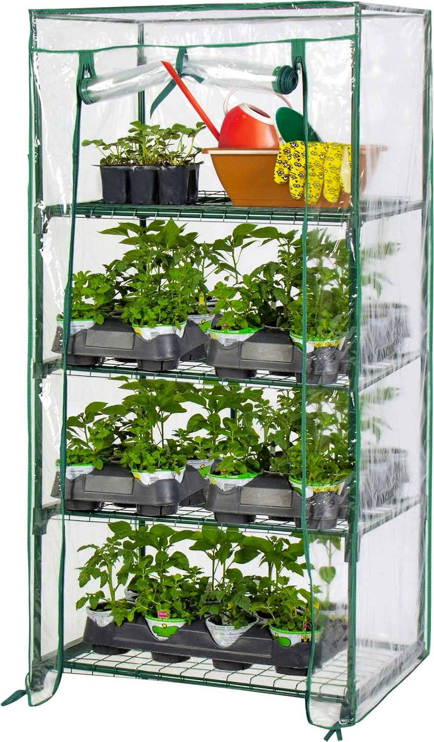 - Большое и широкое окно прямоугольной формы, оснащенное застежками-молниями и подвязкой, позволяет ухаживать за растениями, находящимися внутри.