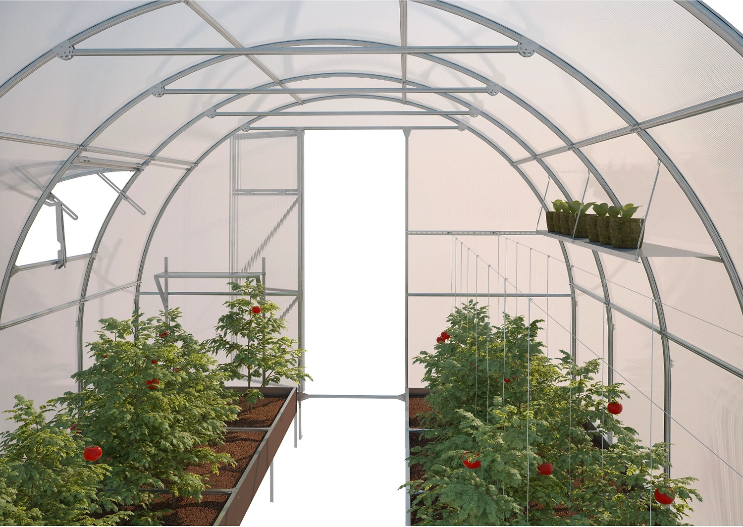 Универсальная полка подходит для теплиц и парников с любым расстоянием между дугами. Устанавливается на боковую поверхность тоннеля теплицы (крепится саморезами к дугам теплицы). Может использоваться для размещения садового инструмента или иных хозяйственных нужд.