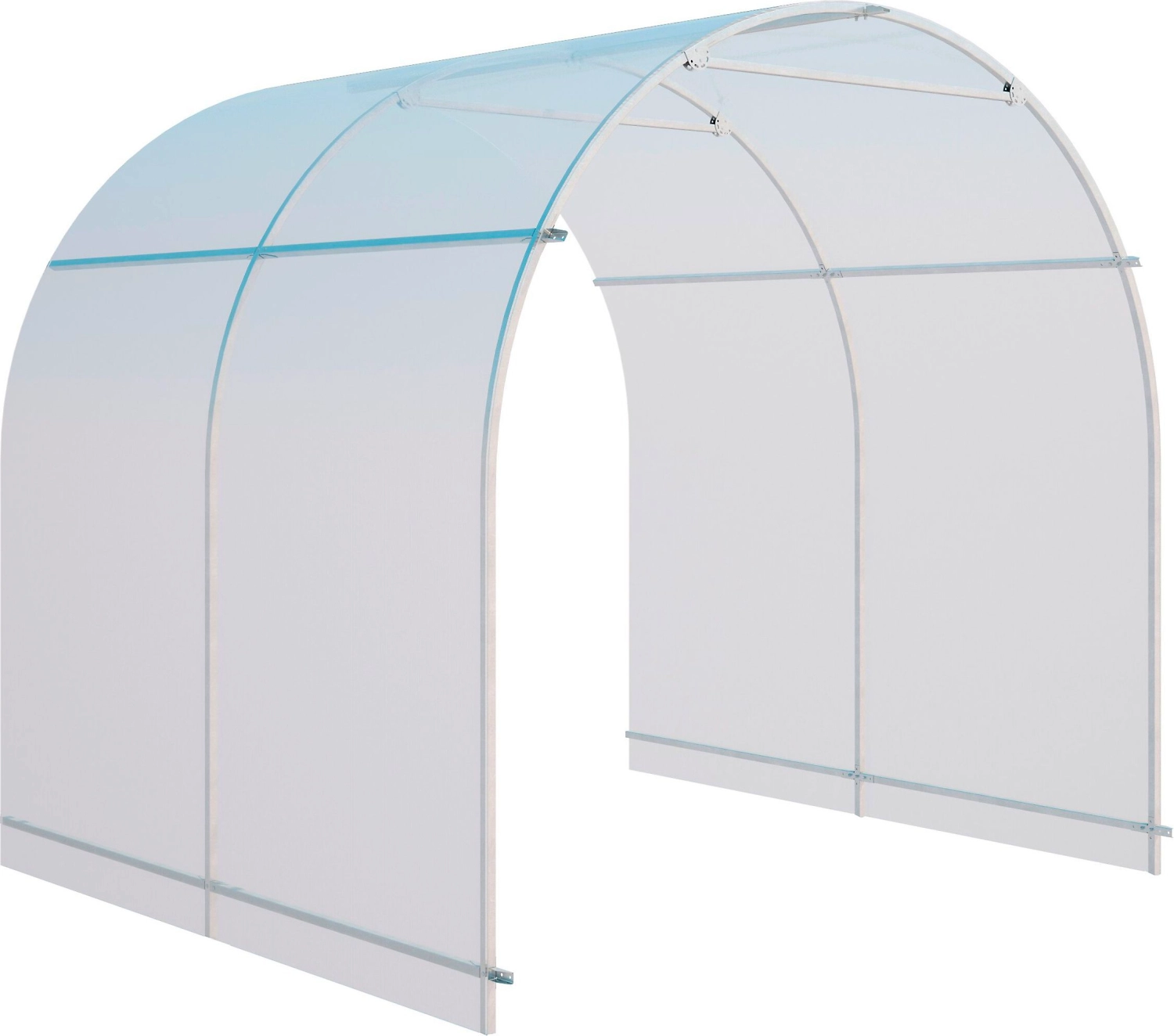 Секция для теплицы Глория из оцинкованной трубы 20х20 мм под сотовый поликарбонат. Ширина каркаса - 2м. Продольные профили (стрингеры) фиксируются на каркасе теплицы при помощи крабовых соединителей. Дуги и стрингеры выведены в оду плоскость. Что защищает поликарбонат от прогиба под весом снегового покрова.