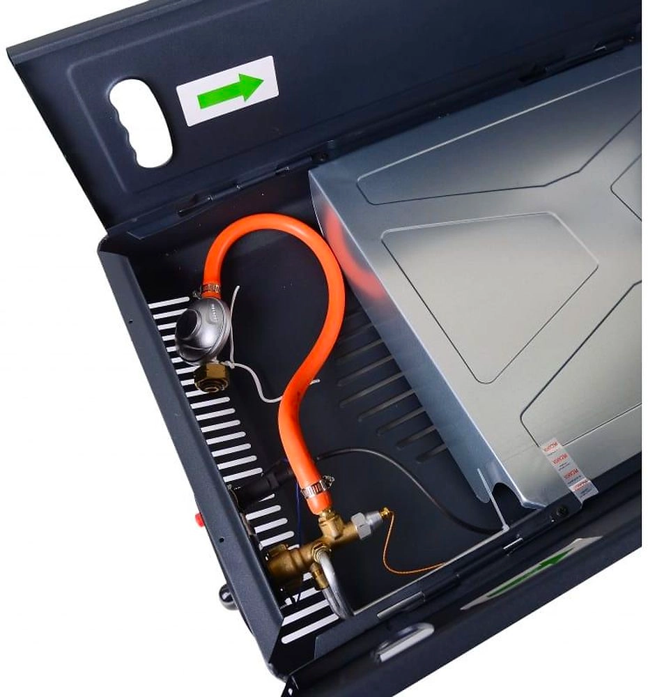 Инфракрасный газовый обогреватель работает на газовом топливе. Теплоотдача осуществляется преимущественно инфракрасным излучением. Данный газовый обогреватель безопасен, эффективен и надежен. Для работы в нём используется исключительно сжиженный газ (пропан, пропан-бутан). Емкости для газа поставляются отдельно. Обогреватель оснащён следующими системами безопасности: 1) Обогреватель автоматически отключается, если внезапно погаснет фитиль. 2) Обогреватель автоматически отключается при его опрокидывании. В этом случае верните нагреватель в вертикальное положение, проверьте на наличие возможных повреждений и подождите 5-10 минут перед повторным зажиганием. Данное устройство также может отключить нагреватель при получении им ударов. 3) Обогреватель автоматически отключается, когда концентрация углекислого газа СО² в воздухе помещения достигает 0,8-1,5%.