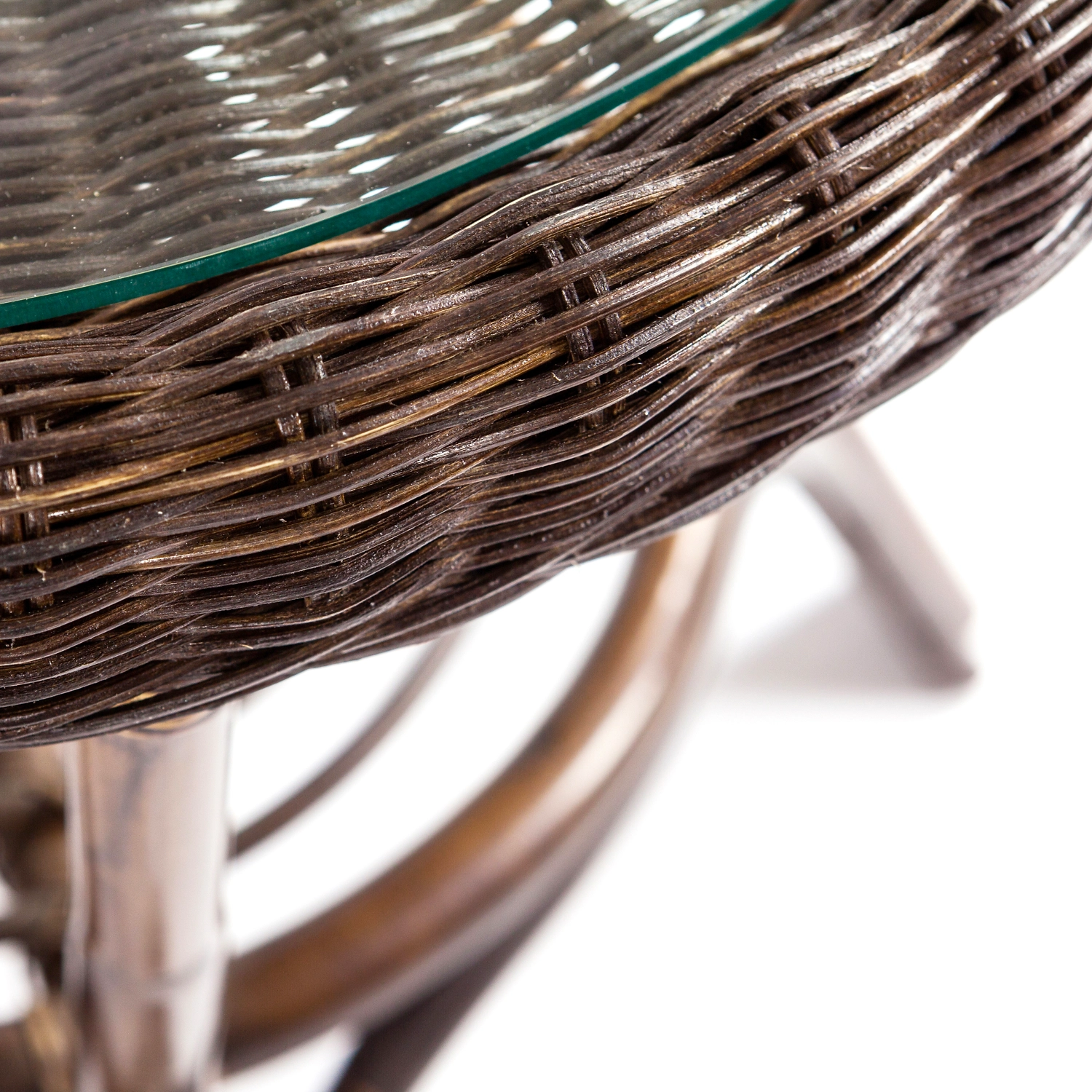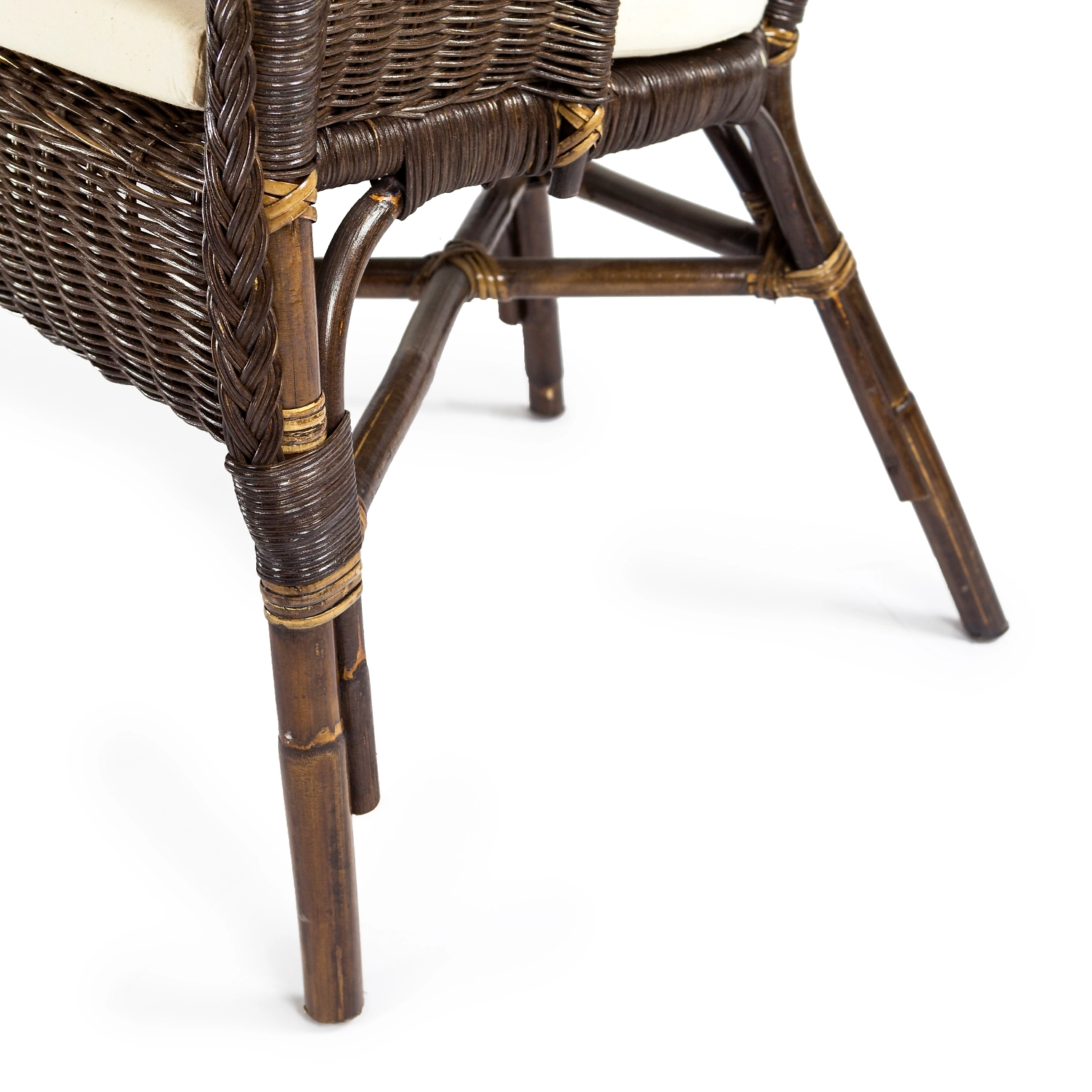 Комплект мебели состоит из трех предметов: двух кресел и столика. Каркас выполнен из натурального тонированного ротанга с мягкими съемными сиденьями.