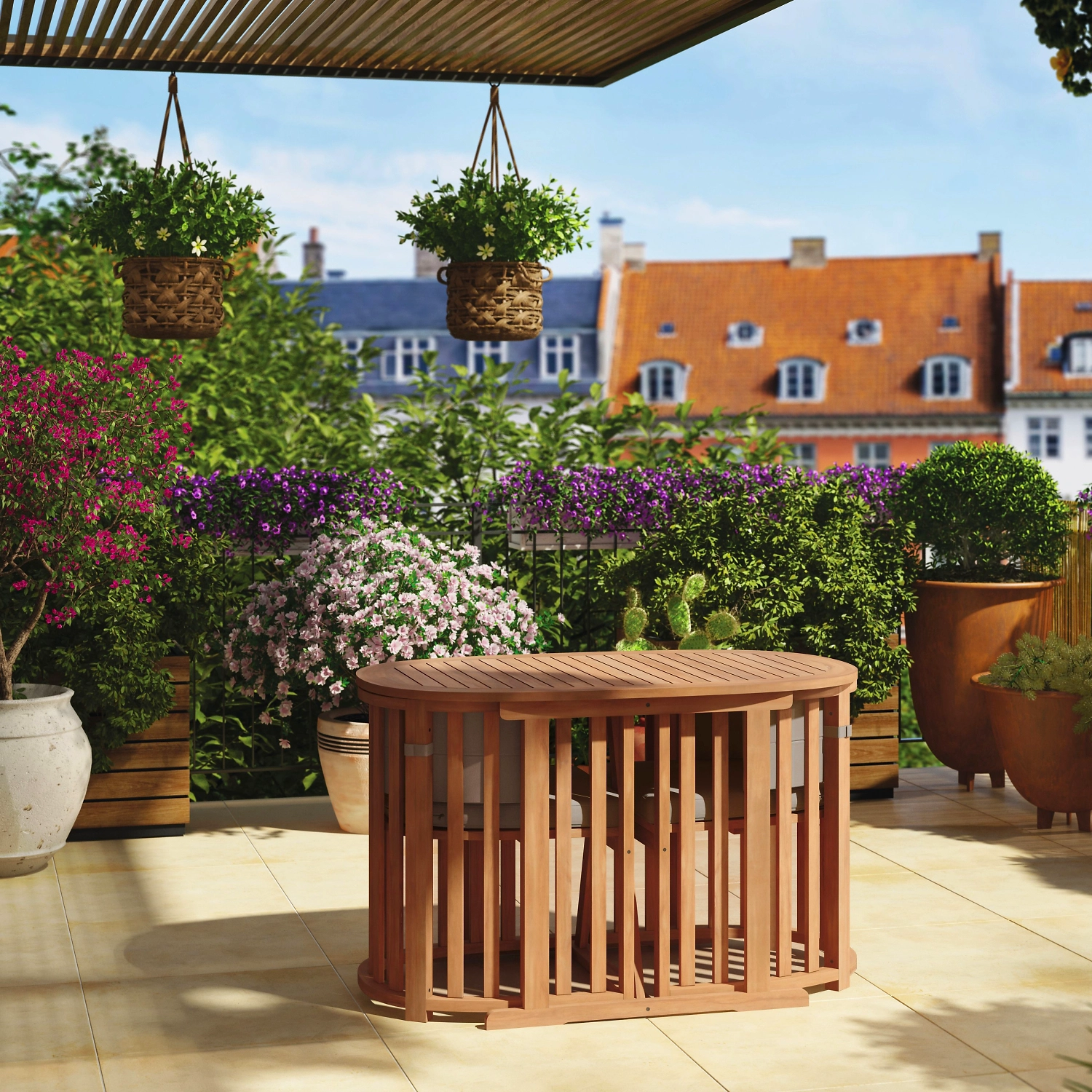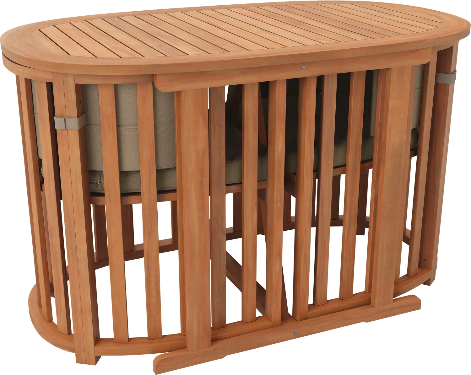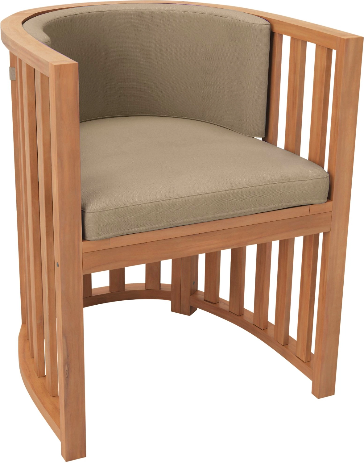 Набор садовой мебели Hervey Bay сочетает практичность современного дизайна с благородством натуральной древесины. Гарнитур состоит из трех предметов: овального столика и двух полукруглых кресел с решетчатыми спинками и мягкими съемными подушками.