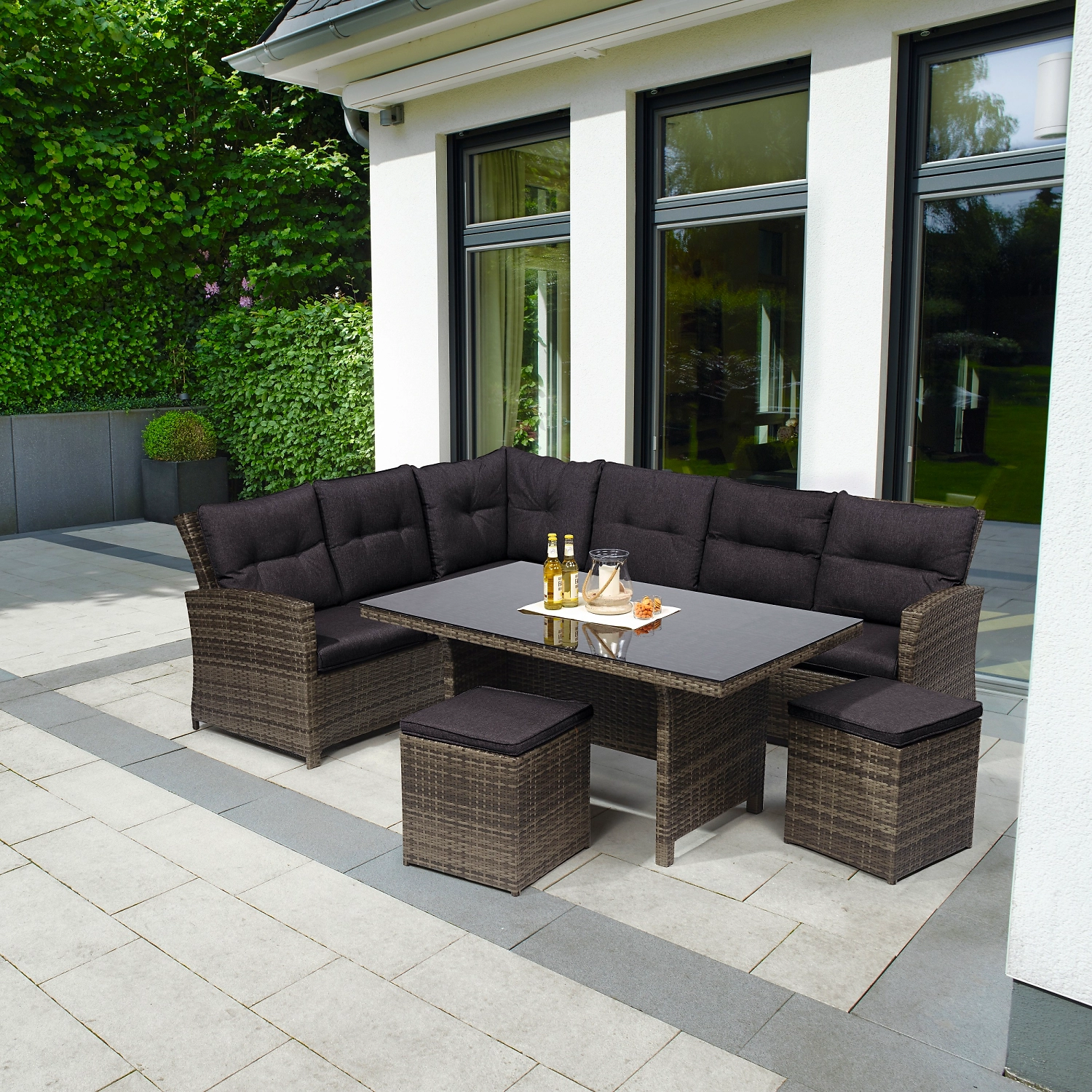 Набор садовой мебели Vermont 5 состоит из углового дивана, двух пуфов и столика из искусственного ротанга. Столешница выполнена из закаленного стекла.