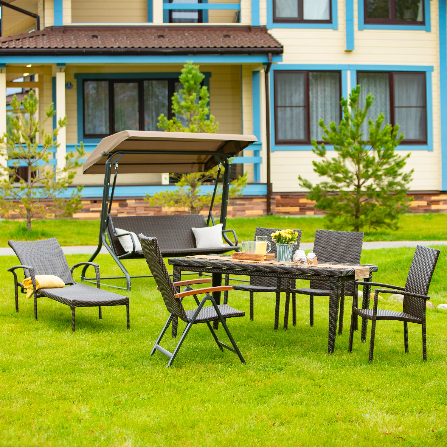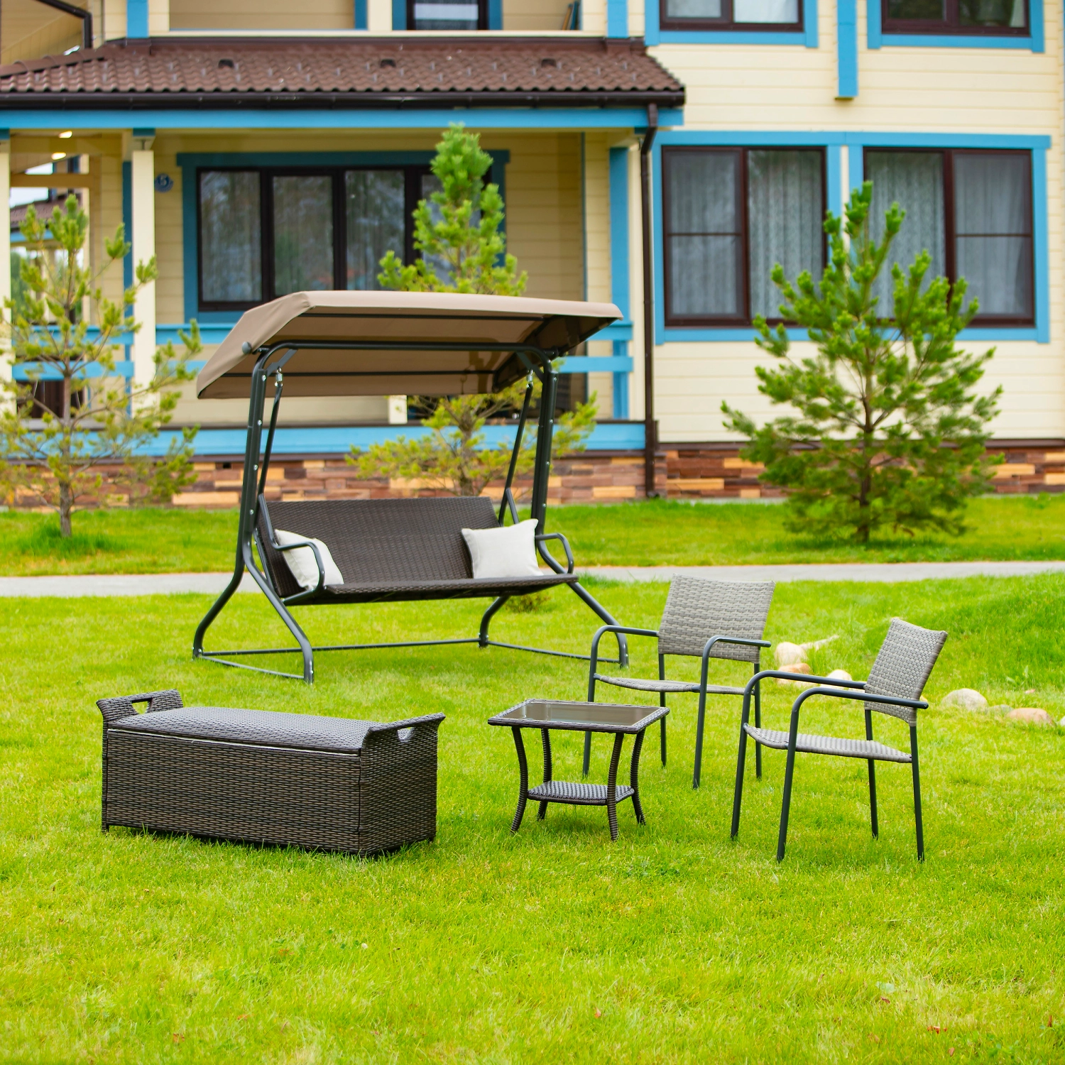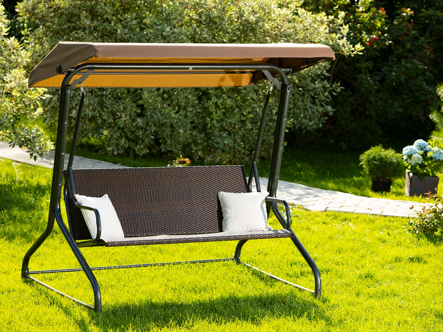 Садовые качели Davenport изготовлены из металла и искусственного ротанга, рассчитаны на размещение трех взрослых, удобны и практичны в эксплуатации. Модель с изящным темно-коричневым каркасом и плетеным сиденьем создает стильный акцент в дизайне ландшафта.