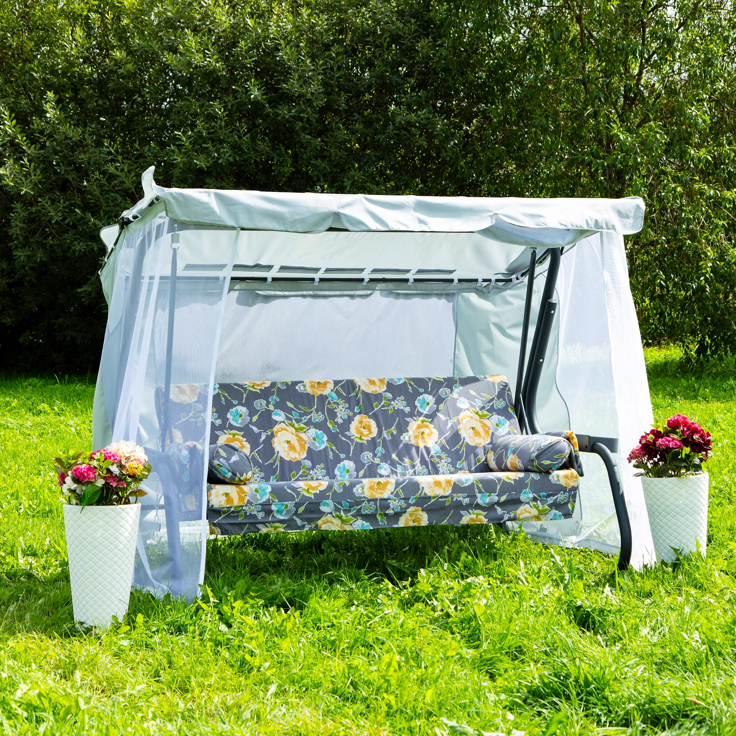 Садовые качели Удачная мебель Корсика - премиум вариант самой популярной на российском рынке модели с москитной сеткой, мягкими подлокотниками и стильным дизайном.