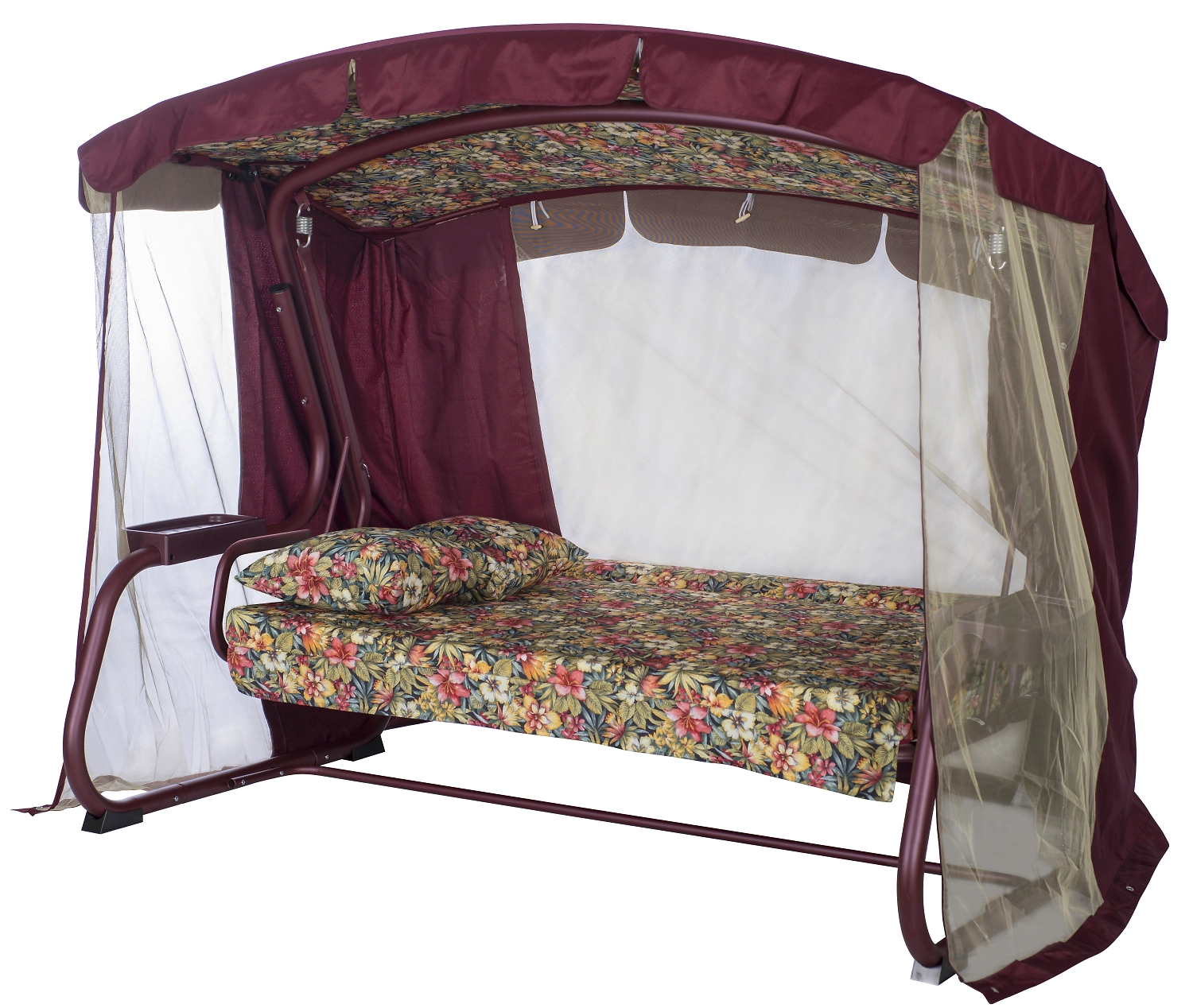 Садовые качели Удачная мебель Риека - это роскошная комфортабельная модель, которая станет настоящим украшением сада или террасы. Мягкая обивка сидения дополнена четырьмя декоративными подушками, сочетание винного оттенка с цветочным принтом придает изделию благородный старинный вид.