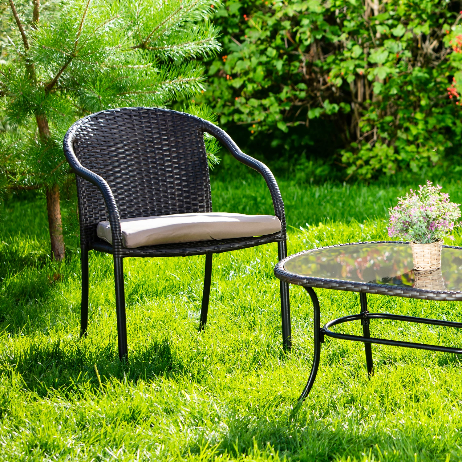 Мебель из искусственного ротанга прекрасно вписывается в дизайн приусадебного участка, помогает обустроить зону отдыха на даче и с комфортом проводить время на свежем воздухе.