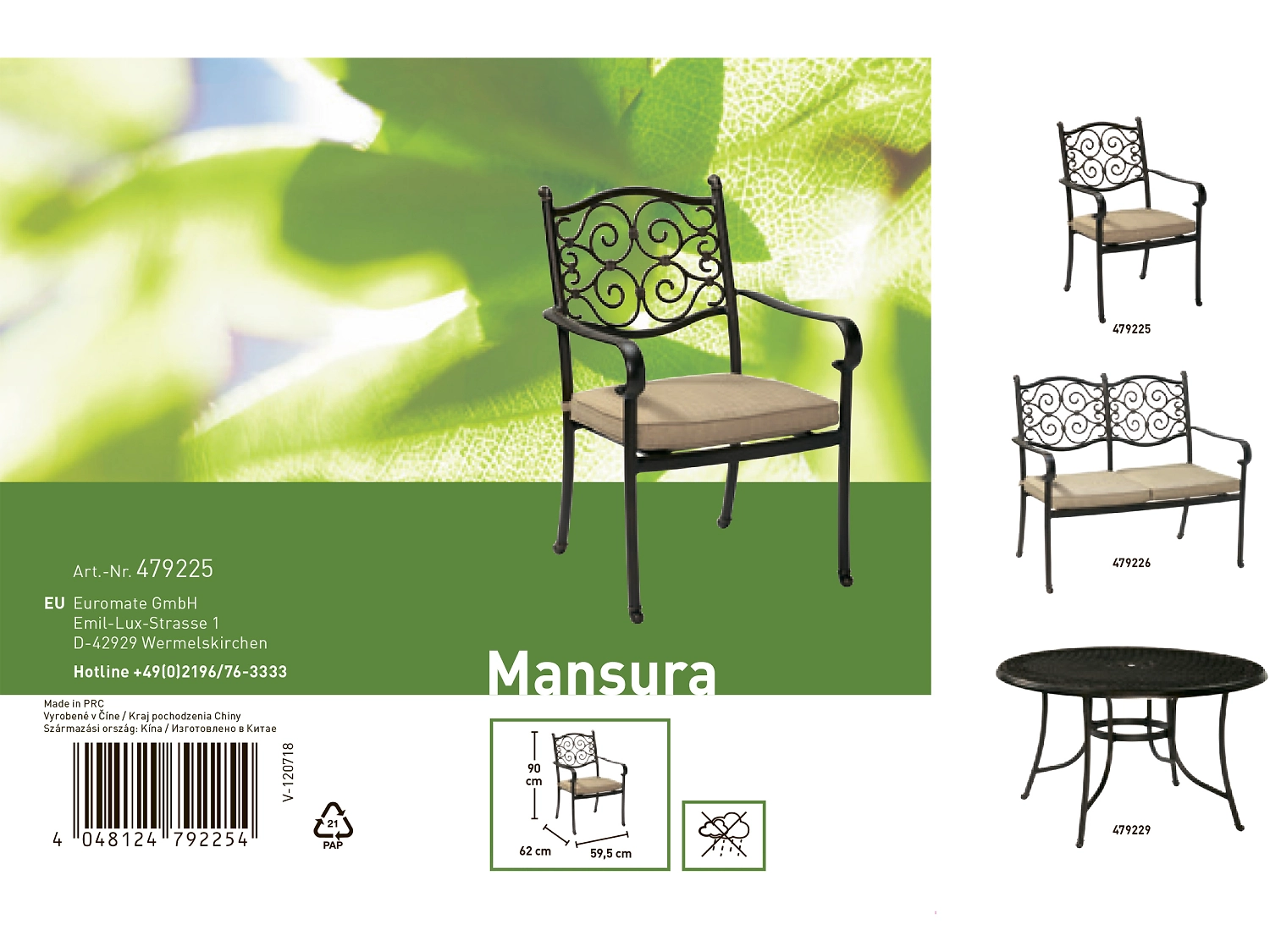 Садовый стул Mansura используется как на открытых уличных площадках, так и в помещении. Благодаря компактным габаритам подходит для организации зоны отдыха на лоджии, балконе, террасе или в беседке. Кресло особенно эффектно смотрится в сочетании с другими предметами мебели из коллекции Mansura.