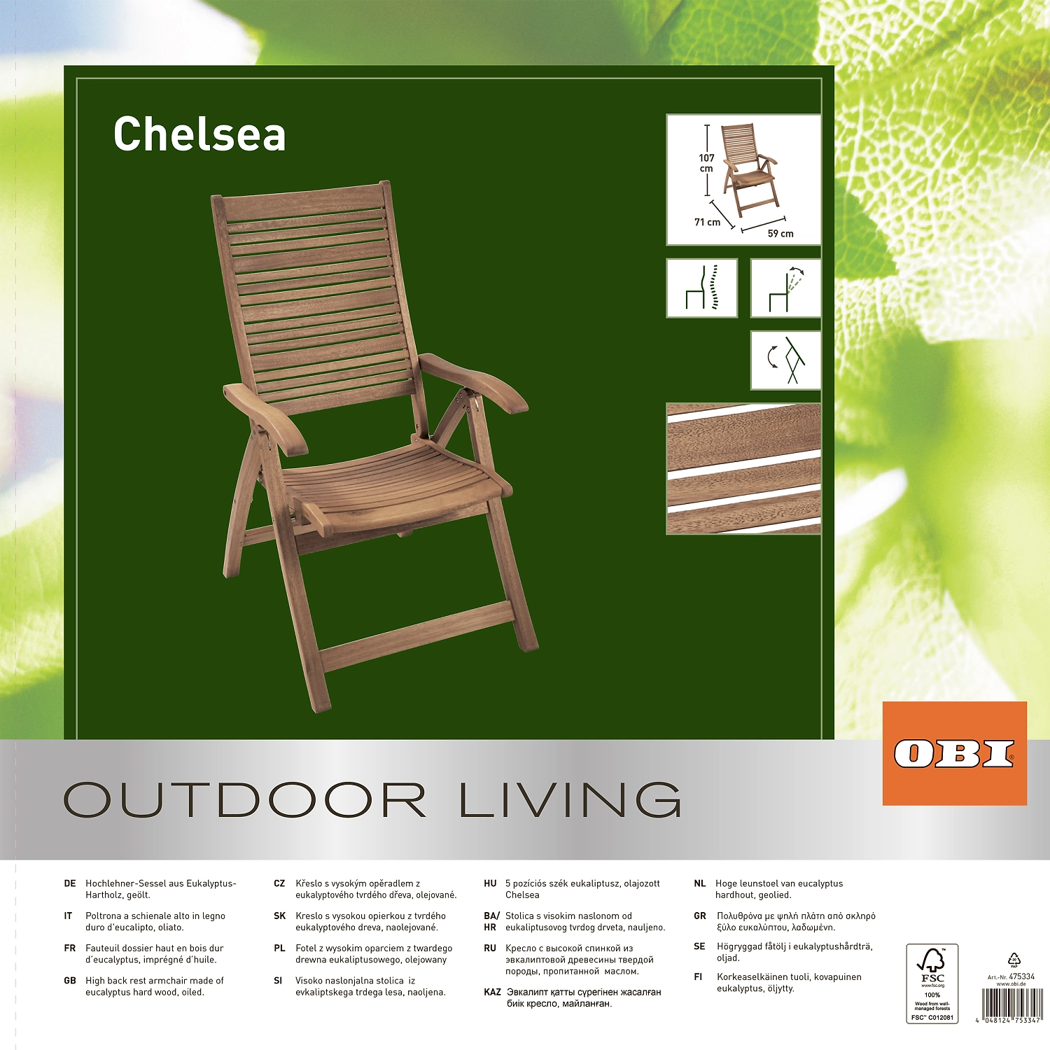 Кресло садовое Chelsea эвкалипт с регулируемой спинкой
