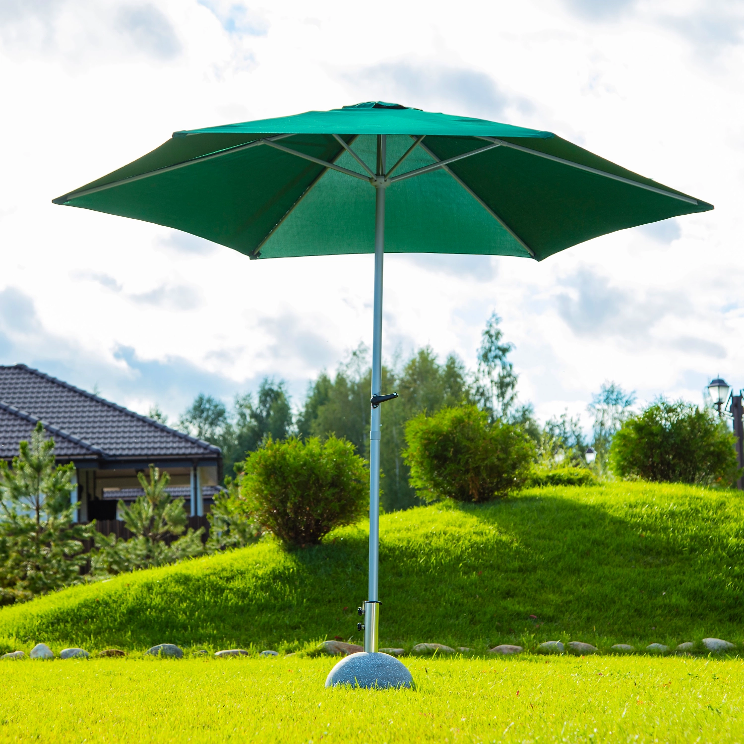 С помощью зонта можно организовать место для пикника, установить под него шезлонг или другую садовую мебель.