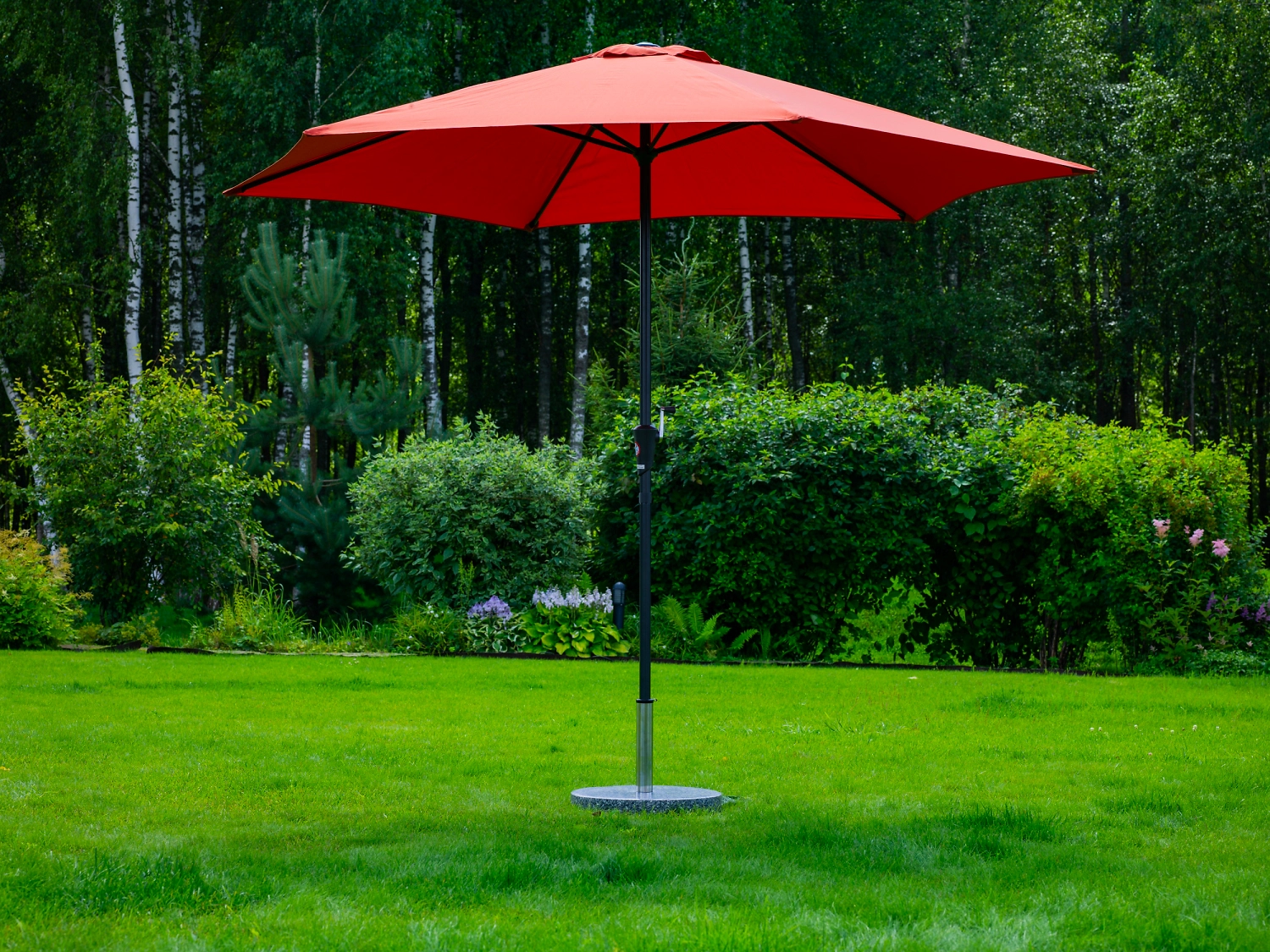 Зонт устанавливается на открытом воздухе в специальную подставку весом 30-35 кг, используется для защиты от прямых солнечных лучей зоны отдыха на дачном или приусадебном участке, на террасе или около бассейна.