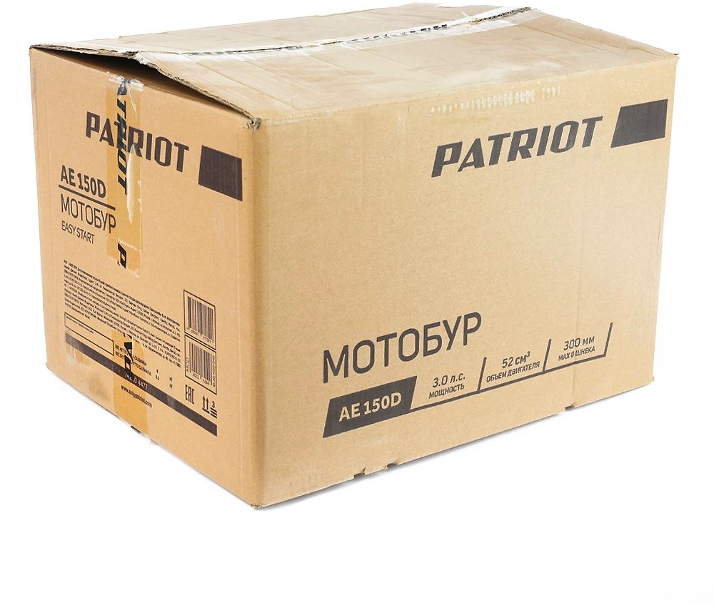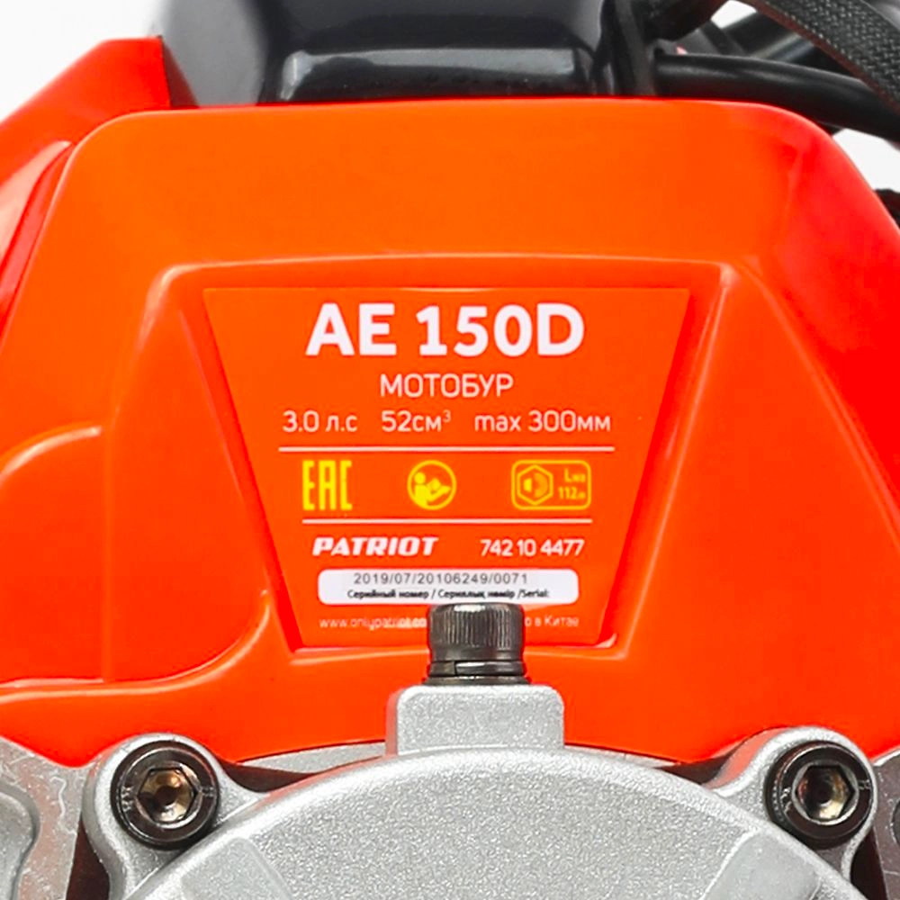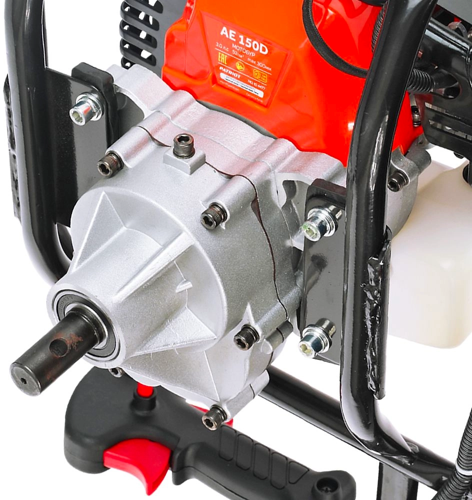 PATRIOT PT AE150D - мощный мотобур с бензиновым двигателем в 3 л.с. и объемом 52 куб. см, предназначенный для сверления отверстий в грунте или льде.