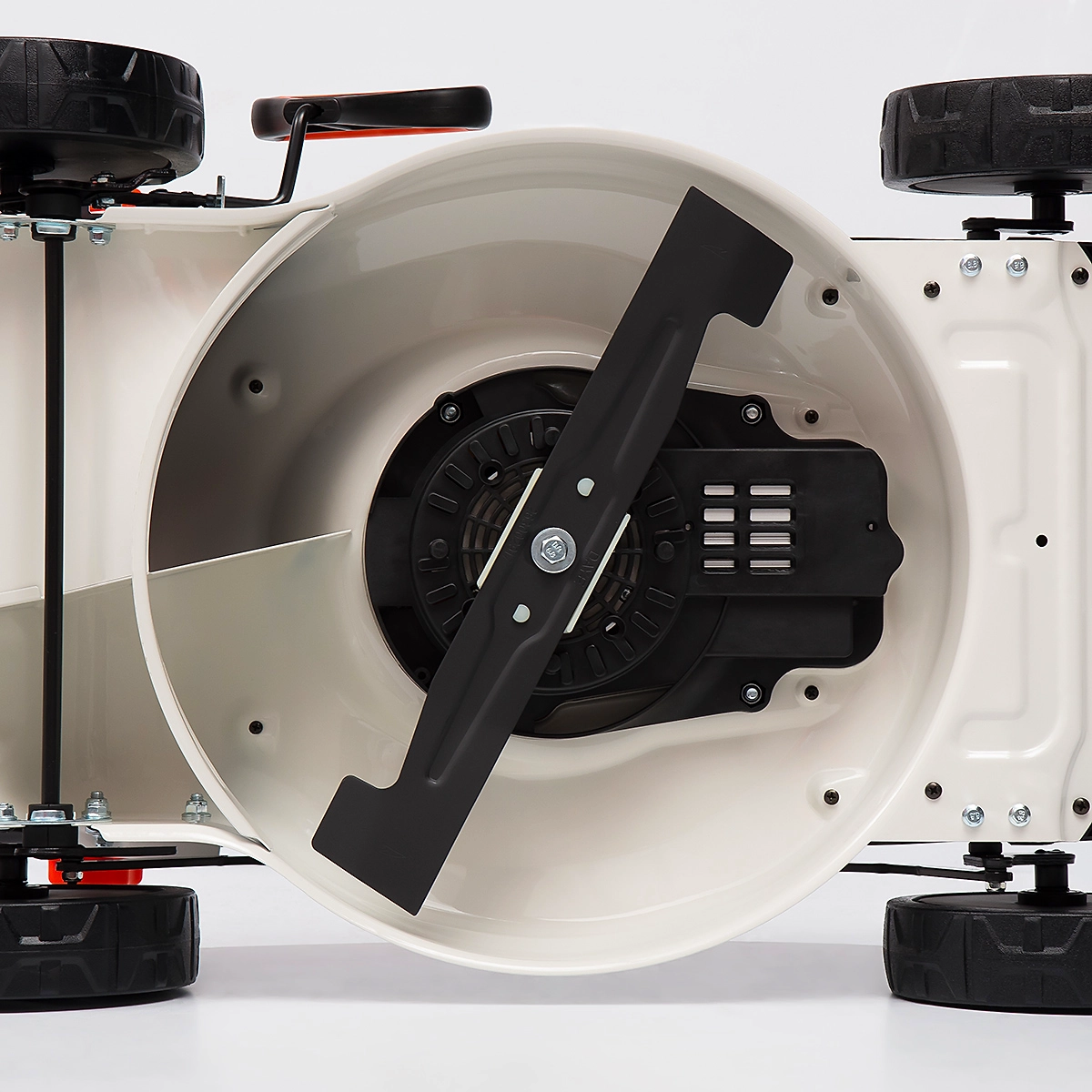 - Настройка режущей деки производится в одно движение - путем смещения рычага, удобно расположенного на панели управления, который изменяет высоту подъема колес.