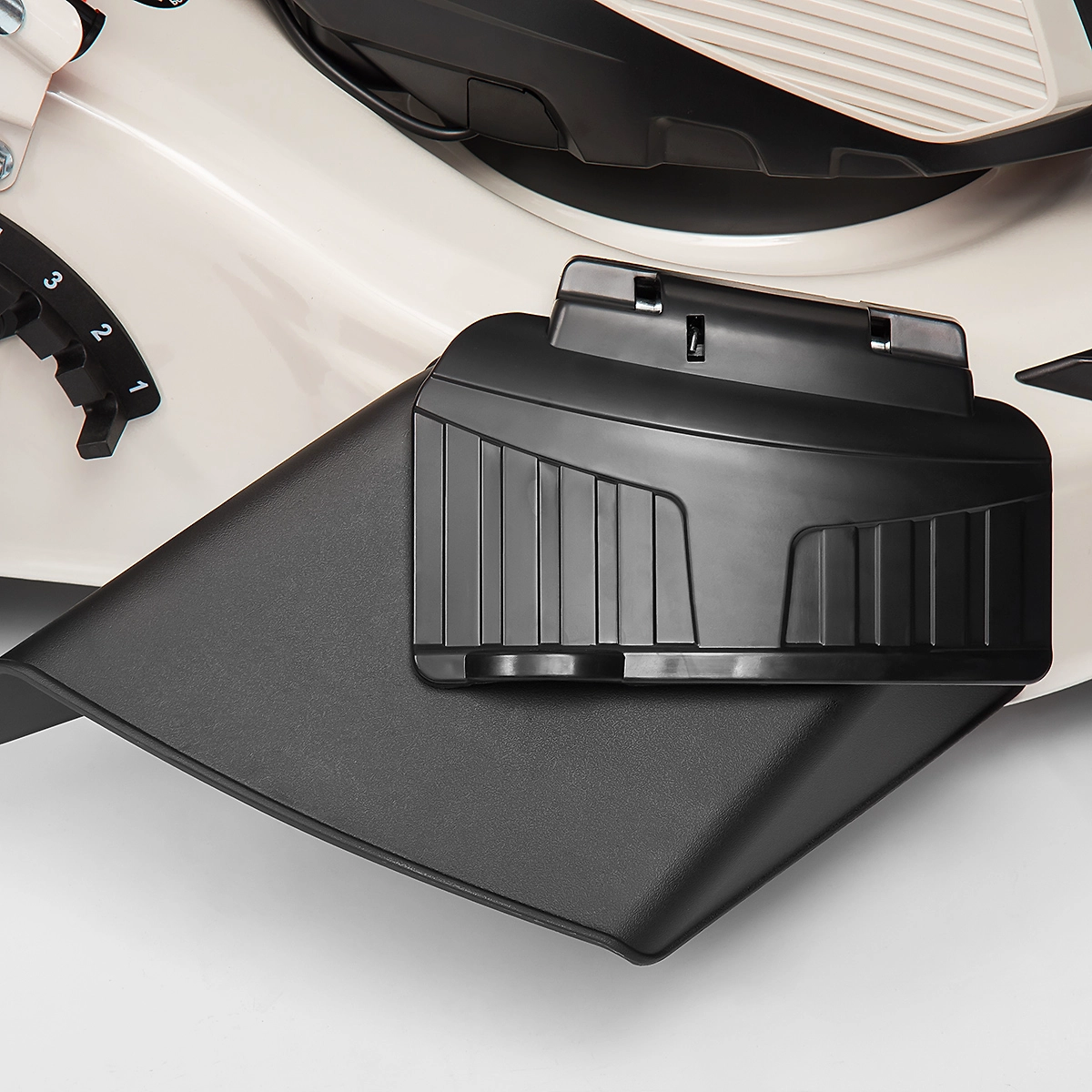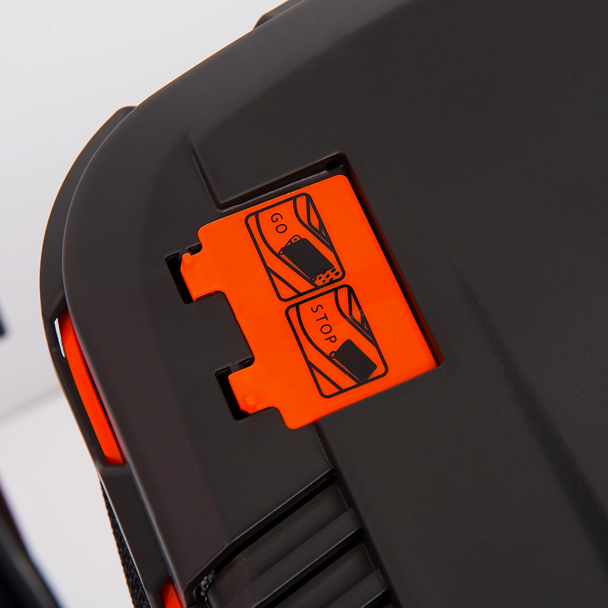 - Настройка режущей деки производится в одно движение - путем смещения рычага, удобно расположенного на панели управления, который изменяет высоту подъема колес.