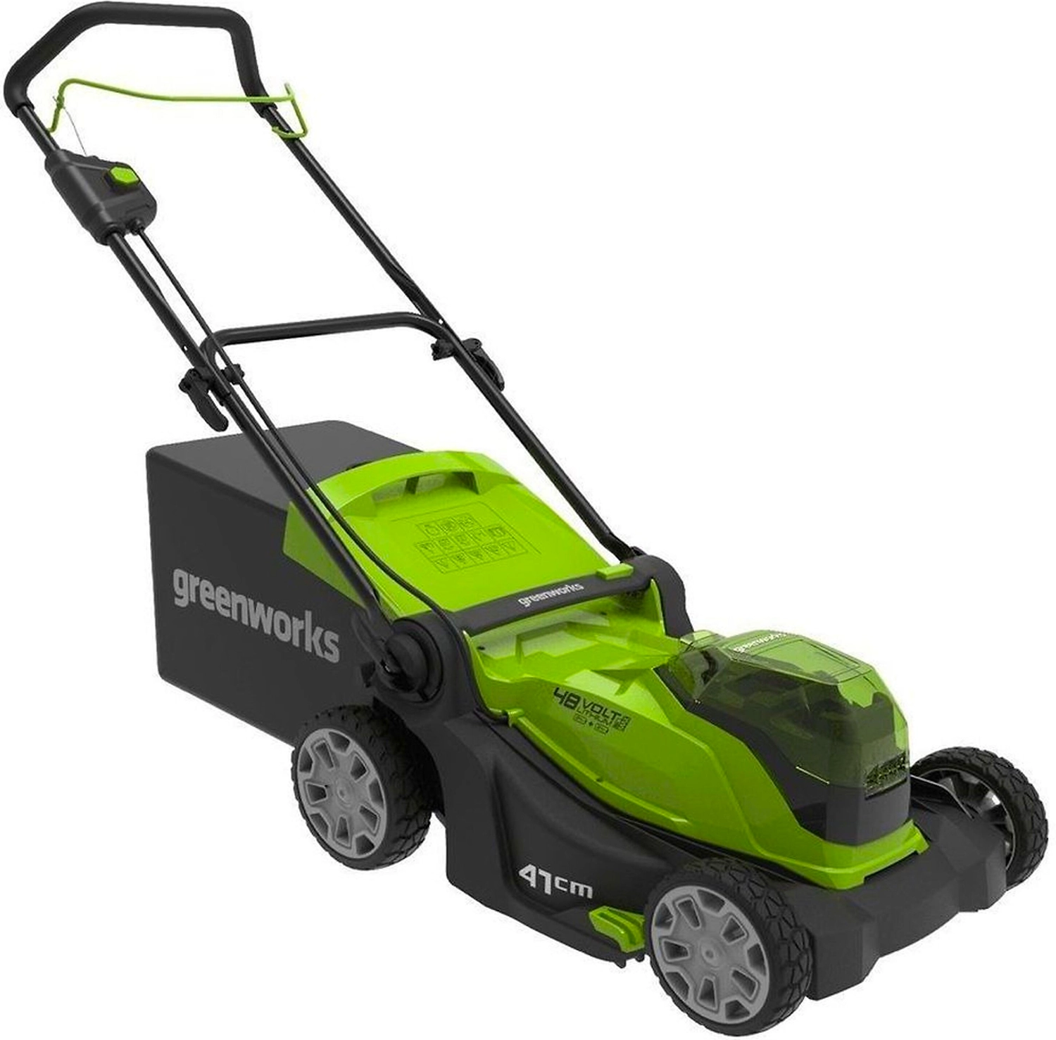 GREENWORKS G24X2LM41 - маневренная аккумуляторная газонокосилка с шириной скашивания 41 см, предназначенная для обработки небольших садовых участков.