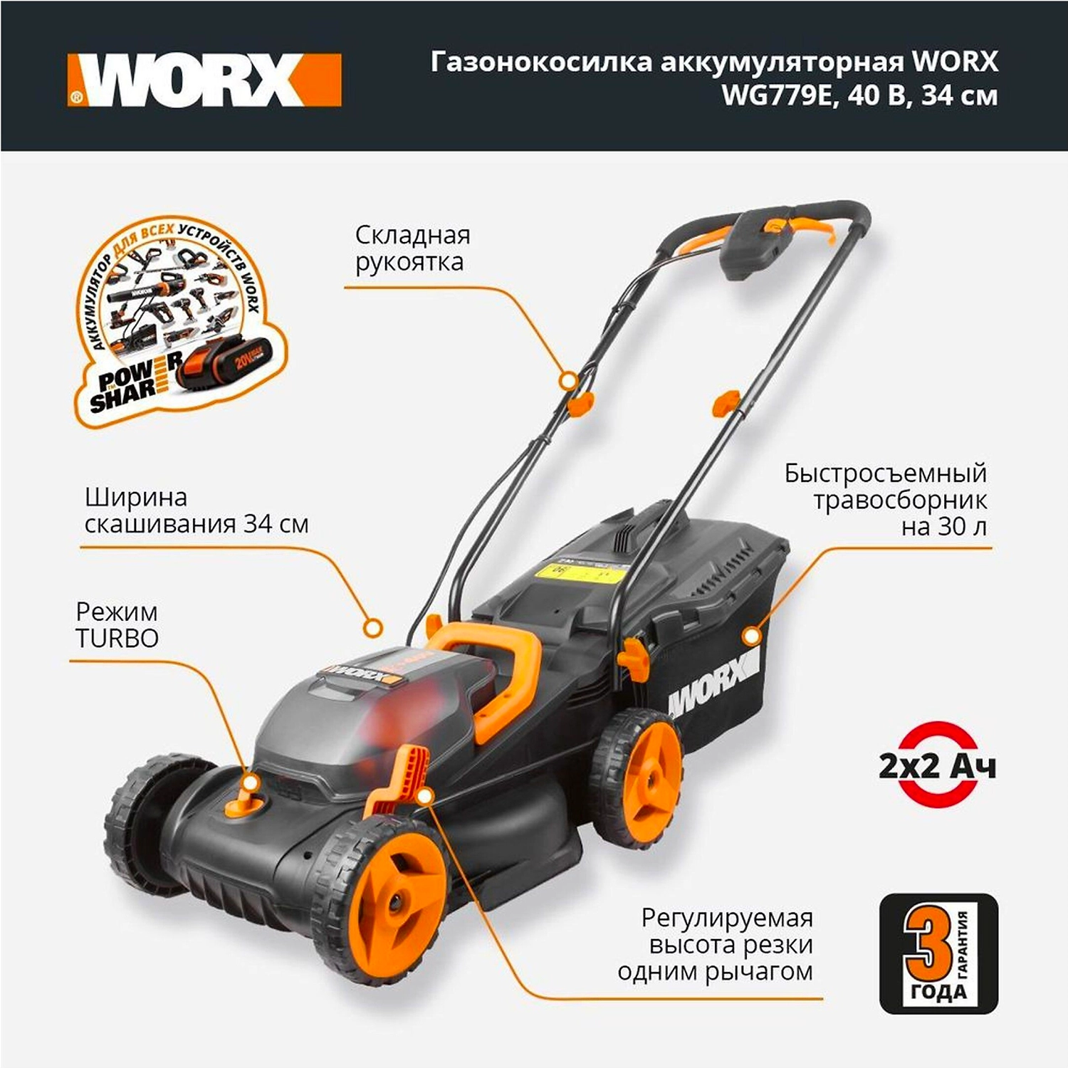 - Аккумуляторы Powershare от газонокосилки WG779E емкостью 2,5 А/ч и мощностью 20 В подходят для других инструментов Worx этой серии.