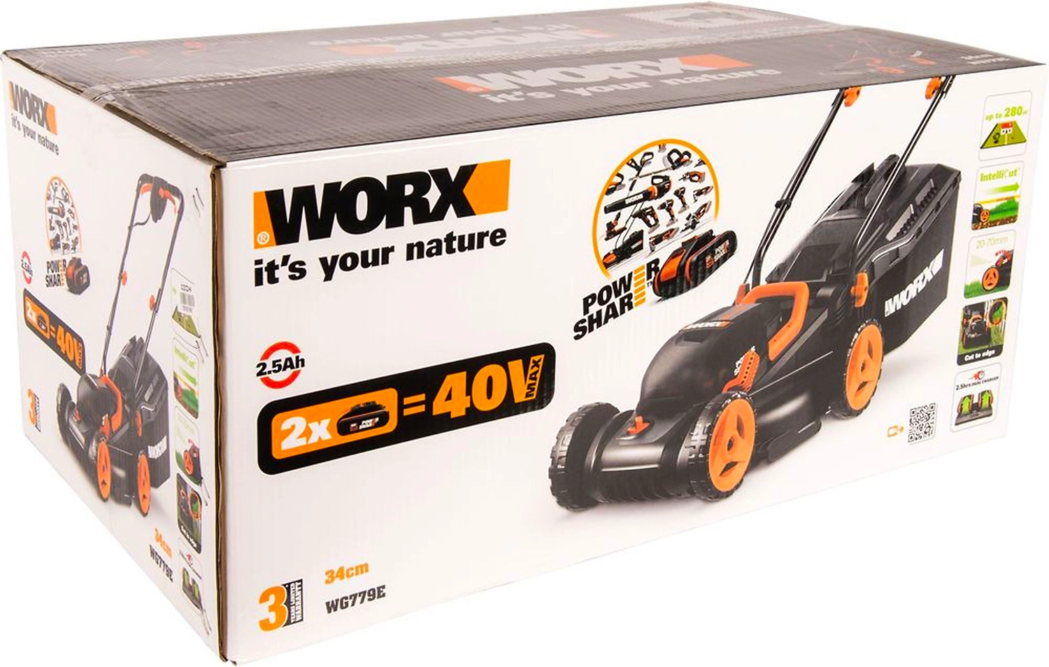 - Газонокосилка WORX WG779E оснащена эффективной и гибкой системой кошения с технологией **IntelliCut** с шириной скашивания 34 см.