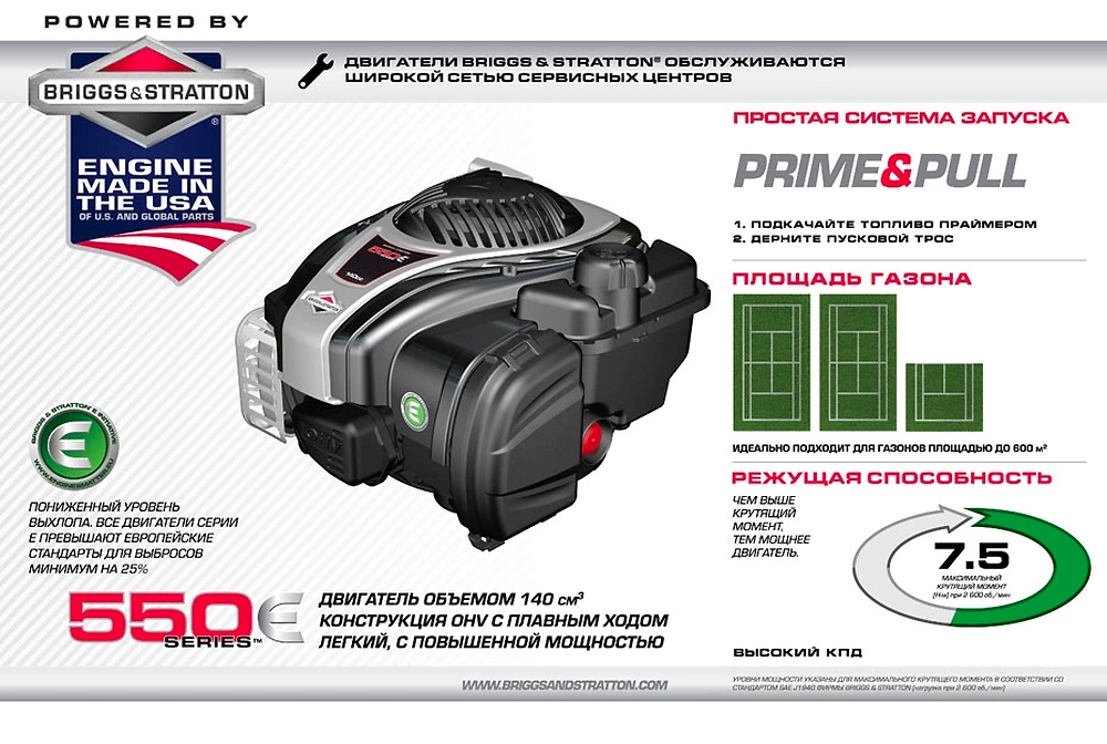 Газонокосилка оснащается четырехтактным одноцилиндровым бензиновым двигателем 550E SERIES, имеющим объем 140 см3 и развивающим мощность 3 л.с. при 2900 об/мин. Его особенность - это уникальная конструкция рабочей камеры, обеспечивающей более полное сгорание топливовоздушной смеси. Поэтому он не только производится меньше вредных выбросов в атмосферу, но также имеет сниженный расход топлива, благодаря чему можно обрабатывать участки площадью до 1400 м2 на одной заправке бака.