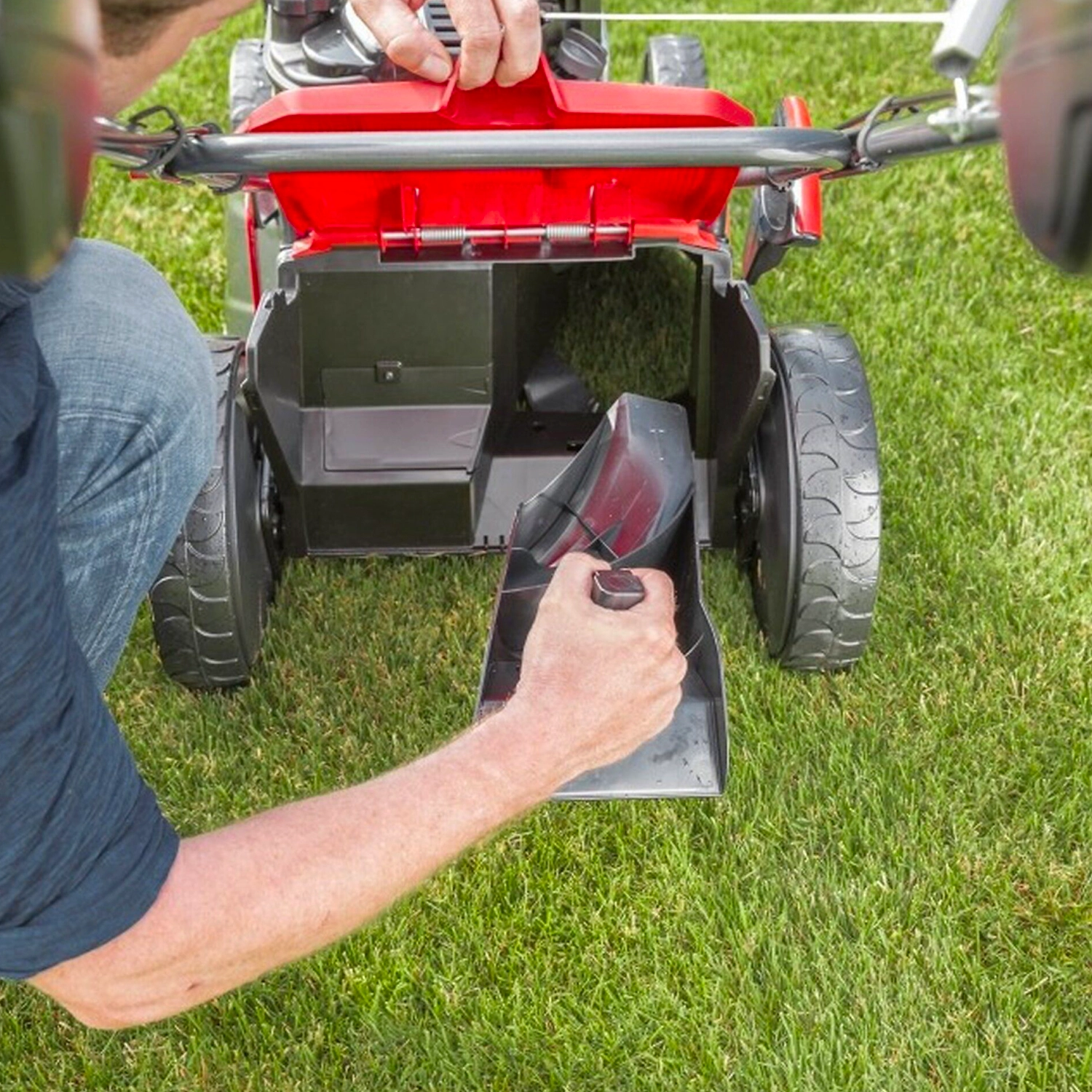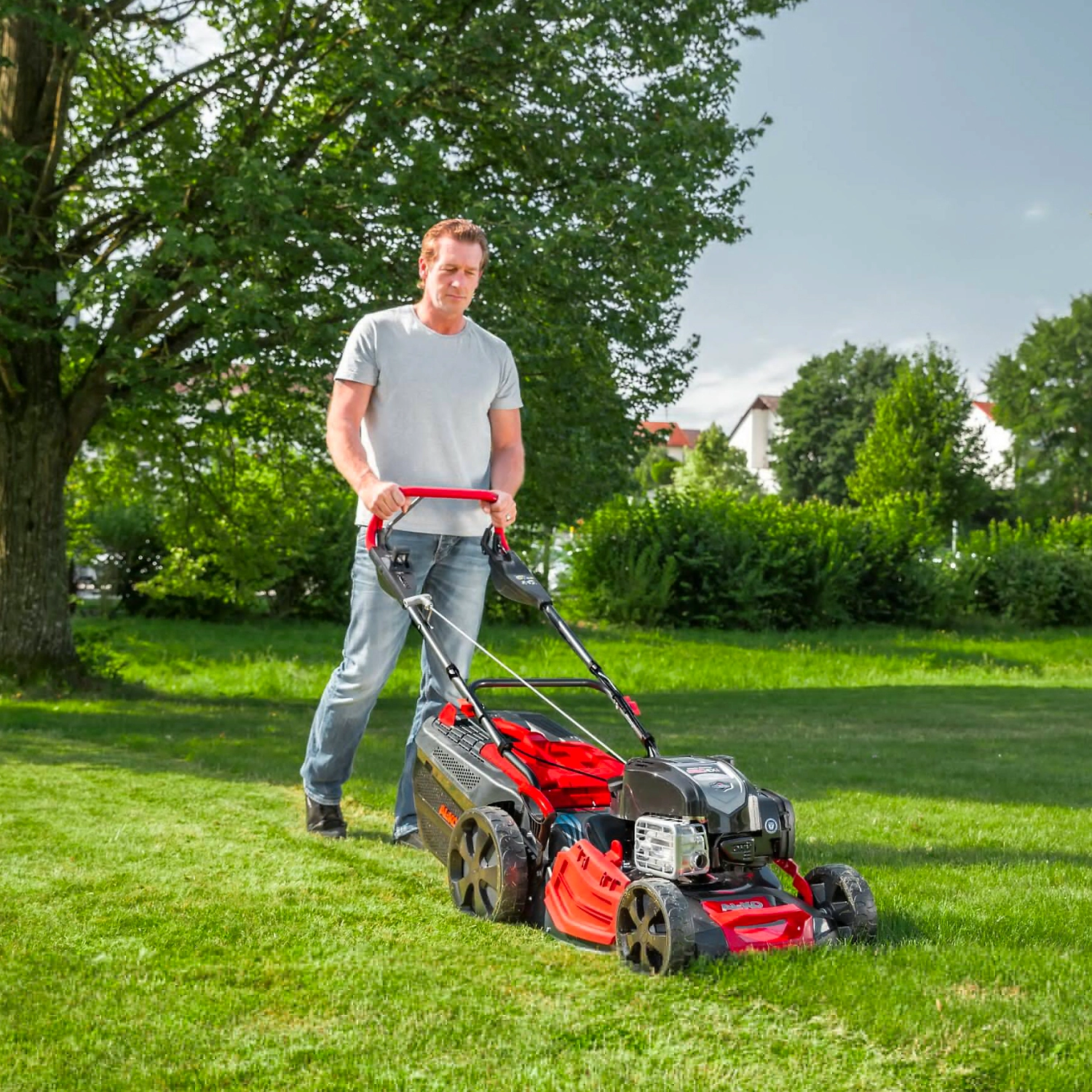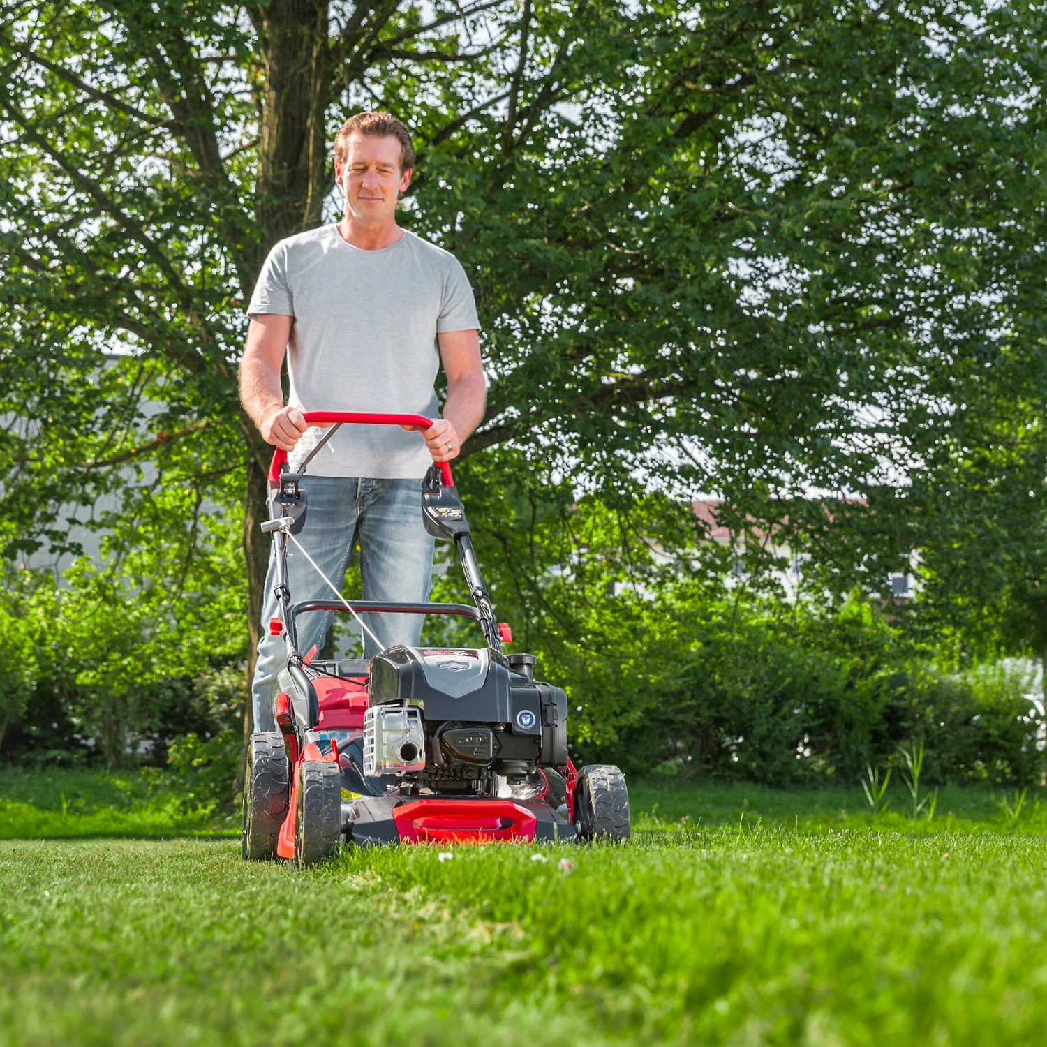 - Многофункциональный инструмент легко справляется со стрижкой, сбором и мульчированием травы, имеет функцию бокового выброса.
