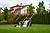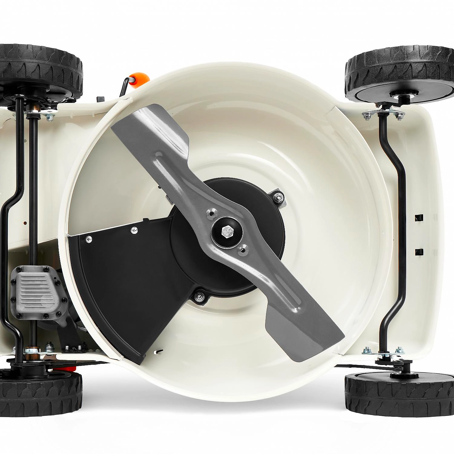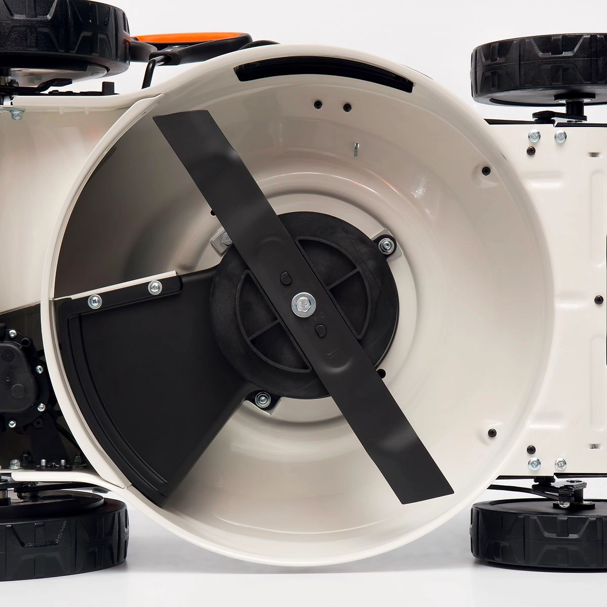 - Благодаря большим колесам с задним приводом газонокосилкой легко управлять и маневрировать на неровных участках.