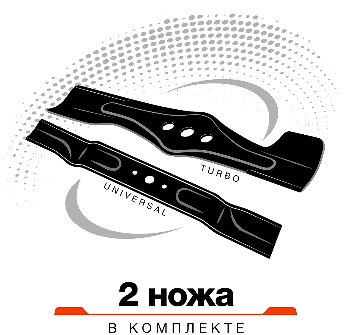 - В комплекте предусмотрены два ножа: аэродинамический для чистого кошения и стандартный универсальный.