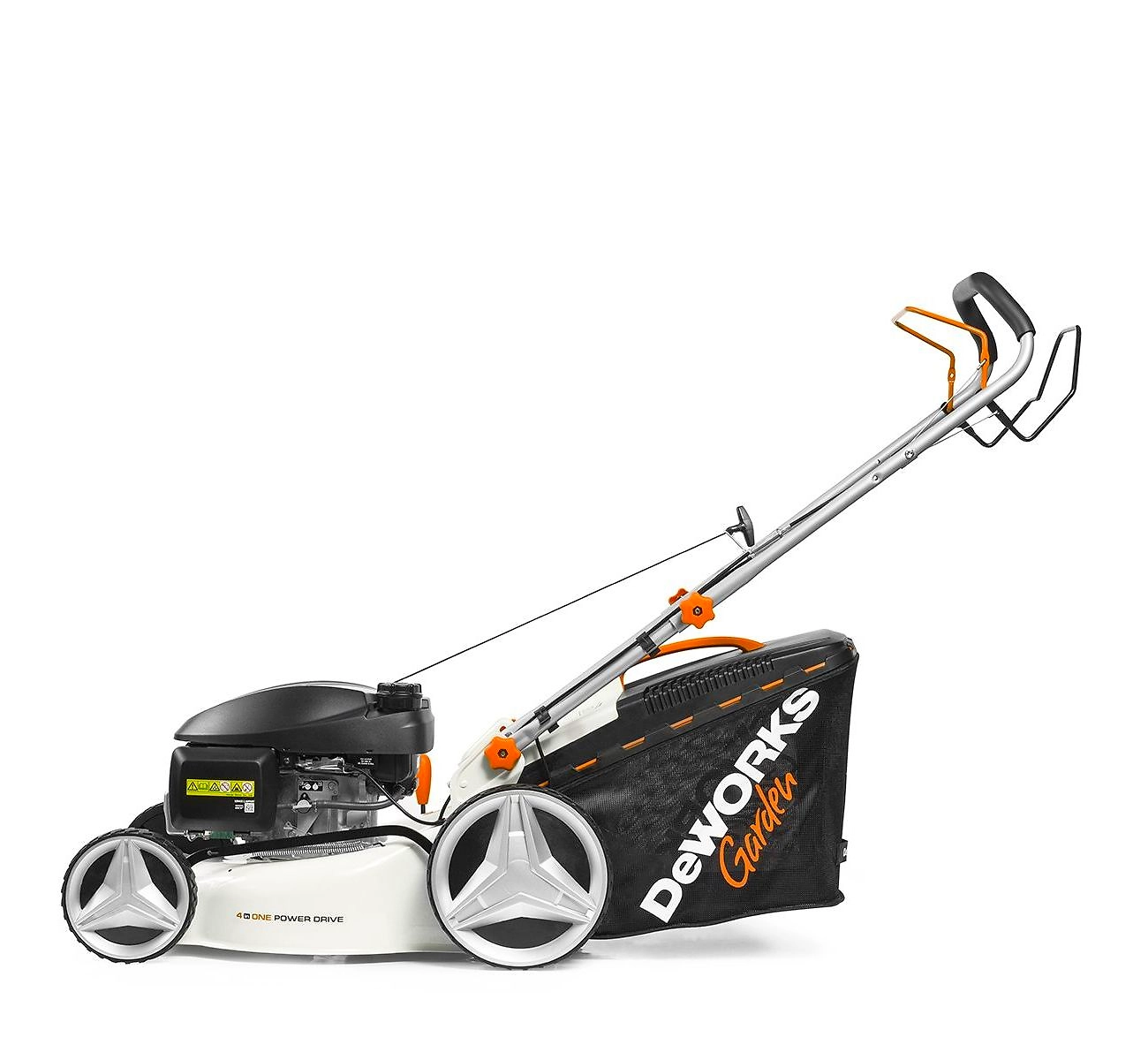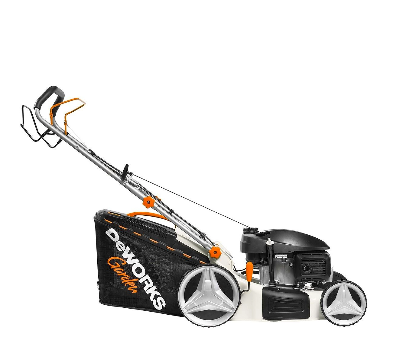 DeWORKS L 50SPH - самоходная бензиновая газонокосилка для кошения травы на больших участках. Устройство скашивает, собирает и мульчирует траву или отбрасывает в сторону.