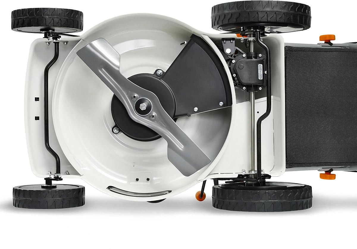 - Стальной турбонож создает мощный воздушный поток, приподнимает траву, увеличивая эффективность кошения на 20%.