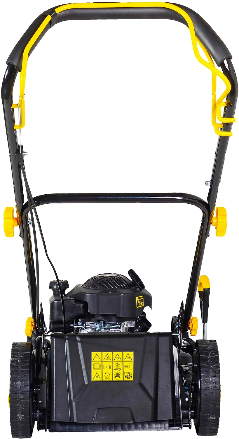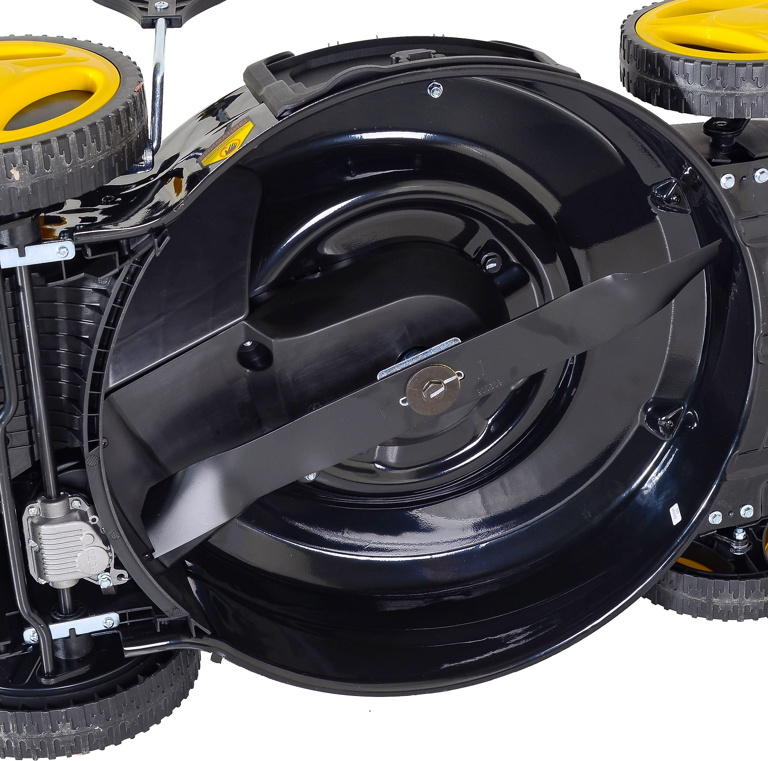 Косилка обладает самоходной конструкцией, оператору не нужно толкать аппарат, только указывать направление движения. Ширина среза – 530 мм, высота регулируется от 25 до 75 мм.