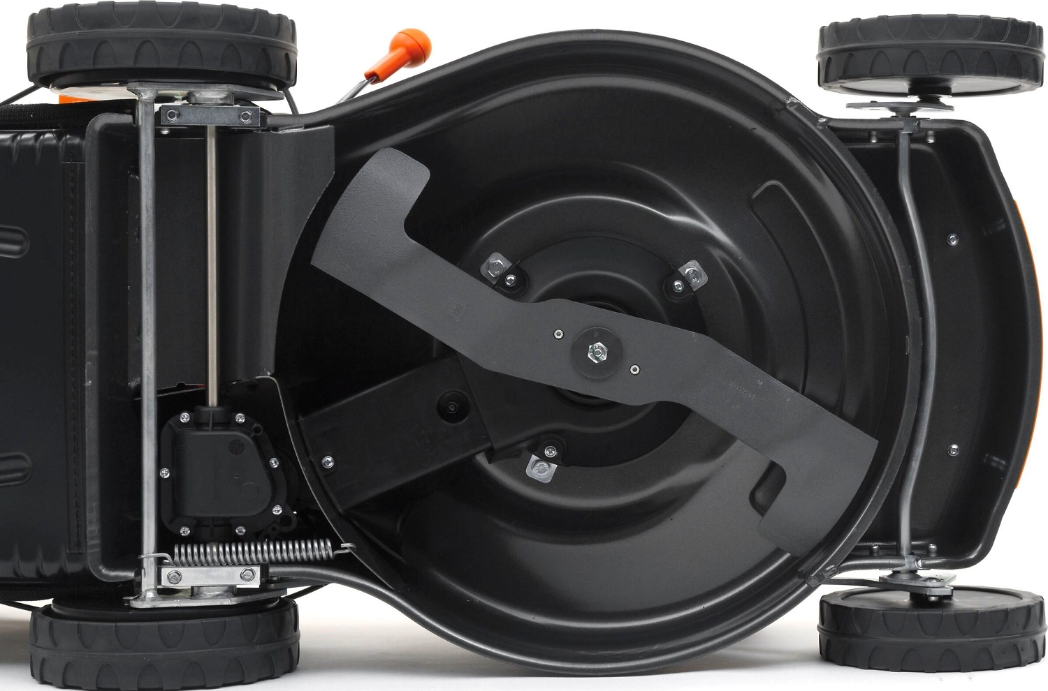 \- Стальной нож эффективно измельчает траву, увеличивая интервалы между остановками для опустошения контейнера.