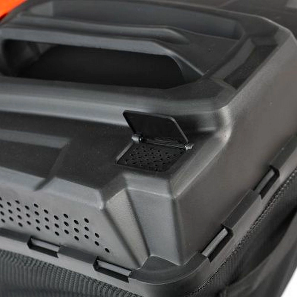 - Травосборник объемом 55 литров изготовлен из пластика и ткани для легкой очистки и компактного хранения.