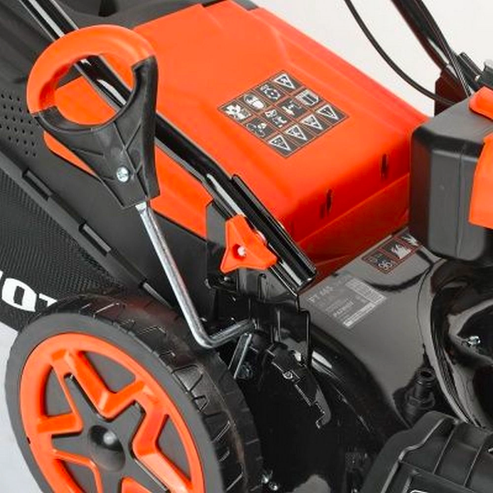 - Широкие прорезиненные колеса не повреждают газон, повышают устойчивость и маневренность косилки.
