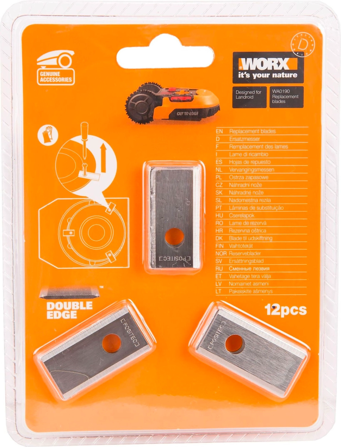 WA0190 - это набор оригинальных лезвий от WORX для роботизированных газонокосилок Landroid. Комплект включает в себя 12 ножей и 12 крепежных винтов. Размер ножа 4см х 2 см х 1 мм. Новые лезвия помогут восстановить производительность вашего Landroid и улучшить качество покоса.