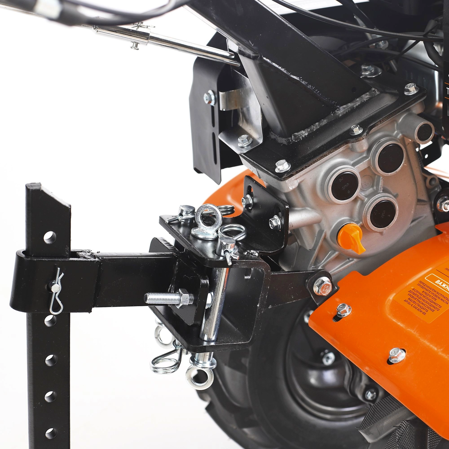 - С помощью стандартного прицепного узла можно закрепить плуг, окучник, тележку, картофелевыкапыватель, установить на мотоблок роторную косилку или снегоуборщик.